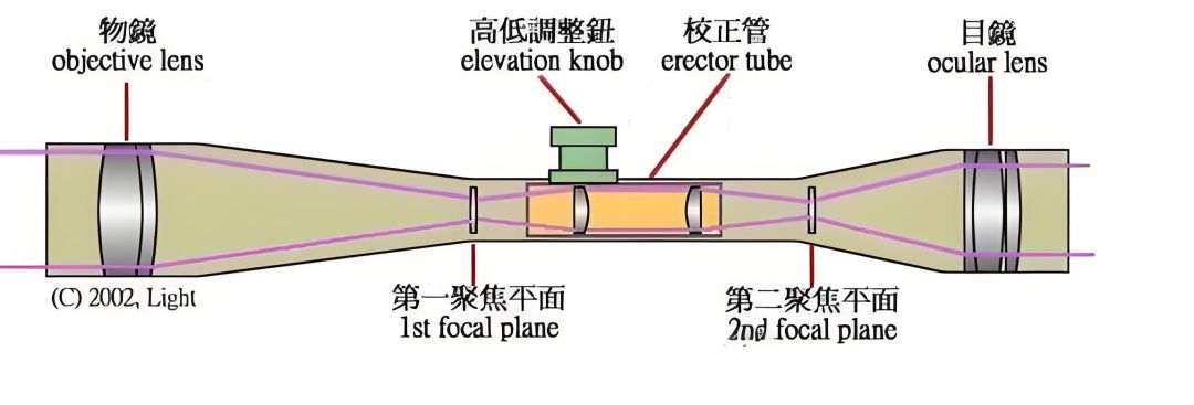 望远镜式瞄具基本结构由物镜、目镜、校正管组成,由于是以折射望远镜的原理为基础设计的,因此镜内还会有两个聚焦平面可以用来放置标线:物镜与正像镜之间的第一焦平面(简称FFP,也称前焦面或物方焦面),以及正像镜与目镜之间的第二焦平面(简称SFP,也称后焦面或像方焦面)。