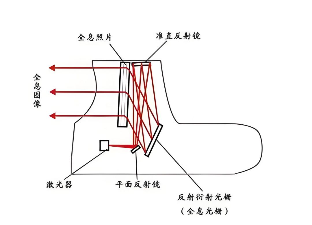 全息式瞄准镜的原理与反射式瞄准镜的最大不同就是其成像原理,反射式瞄准镜的红点是一个反射过的虚像,而全息瞄准镜的红点是全息摄像产生的分划板的全息图像。光源的虚像直接投射在镜面上,激光经过平面反射镜反射到准直反射镜上,再反射到全息光栅,经全息光栅照射在全息照片上,再经过衍射传入人眼,进入人眼后照射出一束与枪械平行的光线照向了目标的图像,用这个像与目标对准,完成瞄准。