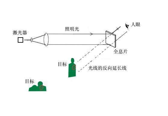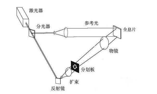 全息瞄准镜里的激光器发出激光被分光器分为两束,其中一束经过透镜组括束并准直成平行光,作为参考光直接照射到全息感光底片上。