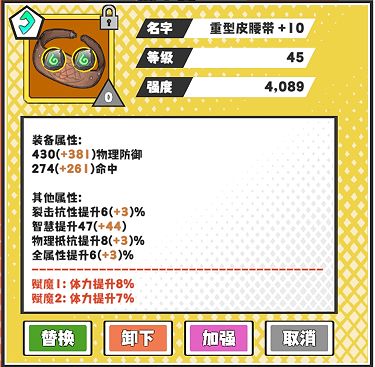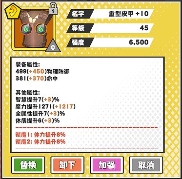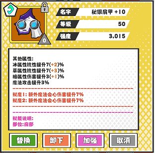 副属性:额外减伤%,命中提升%,体力提升%,魔力消耗降低%,CD降低。