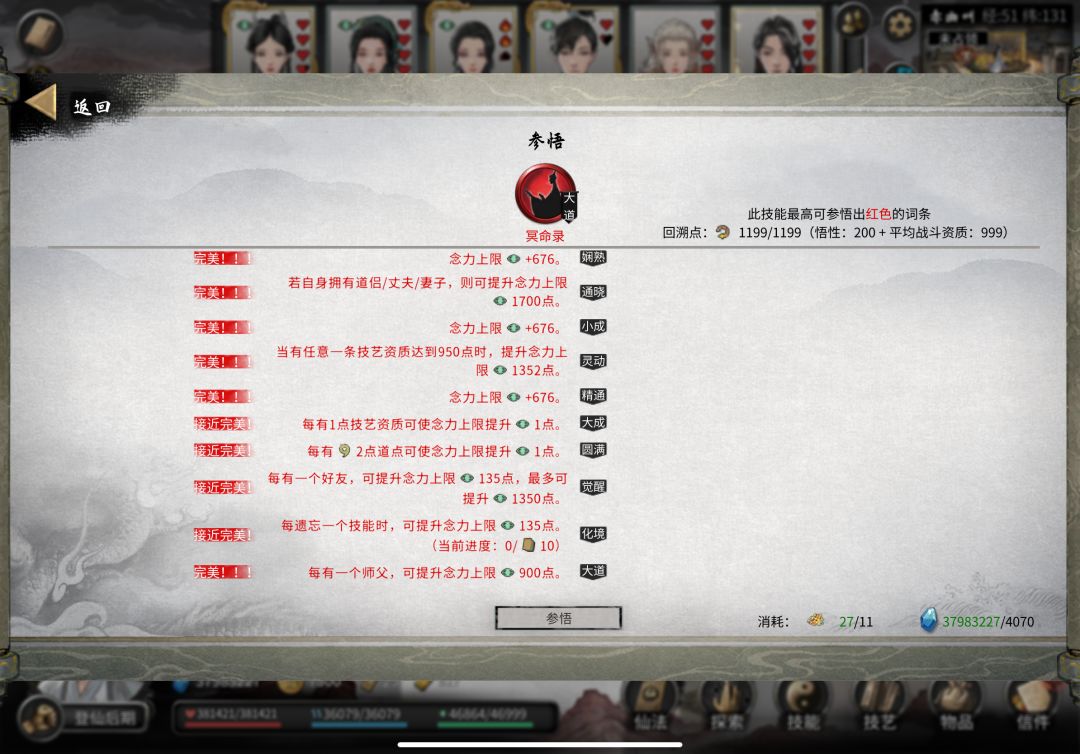 经过我不懈的努力,终于达到了不开修改器的五登仙法宝,主要还看录的词条,我全洗了加念力的词条,然后通过喝酒的buff最后达到了4万7的念力,再加上器灵的减少念力占用词条,最后实现五登仙法宝。