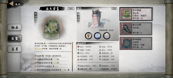 最后,还是要靠仙法加火增伤一点点把鸡哥磨死,这里说一下器灵,到了这里,其他境界的法宝都是摆设,鸡哥随手一个技能把你法宝干废。如果要用法宝,建议登神吞天搭配烛遥月,天赋尽量点满,兼顾输出的同时还能提高法宝的血量和持续时间,即便是放三幻神中间,也是可以站住脚的。