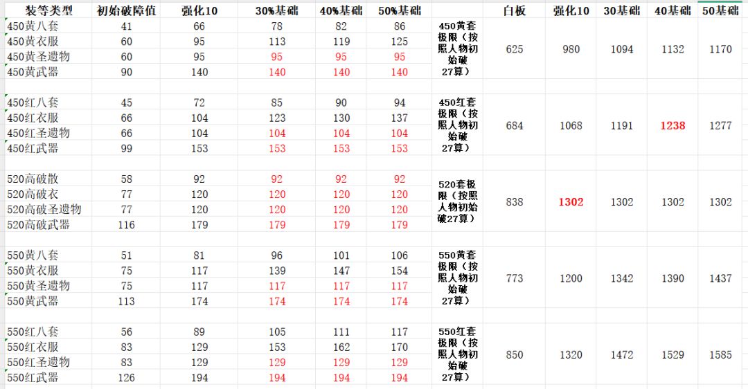 给大家问尤其萌新一个堆破瘴的参考。破瘴分为三种数值,武器,衣服-圣物-遗物,其他。目前:460红武器上限:103460红衣服-圣物-遗物上限:69460红其他部件上限:52强化10破瘴计算...