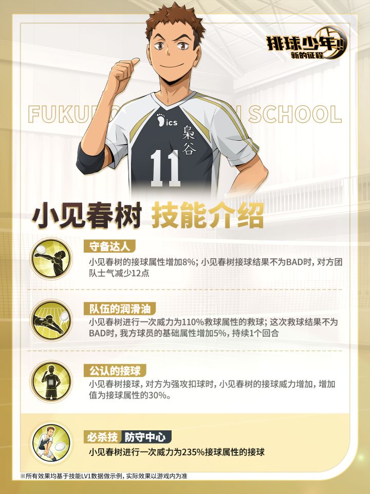 小见春树接球属性增加;小见春树接球结果不为BAD时,对方团队士气减少。