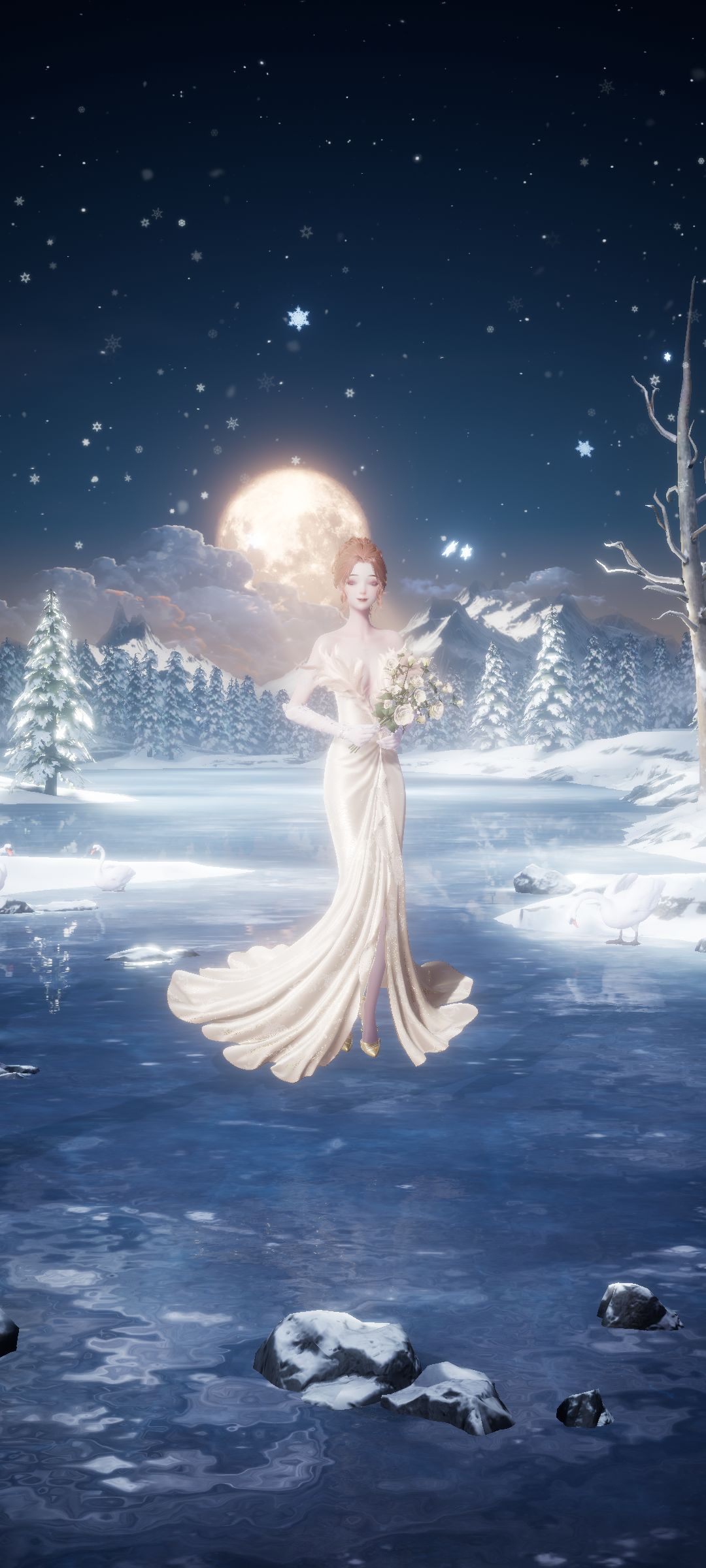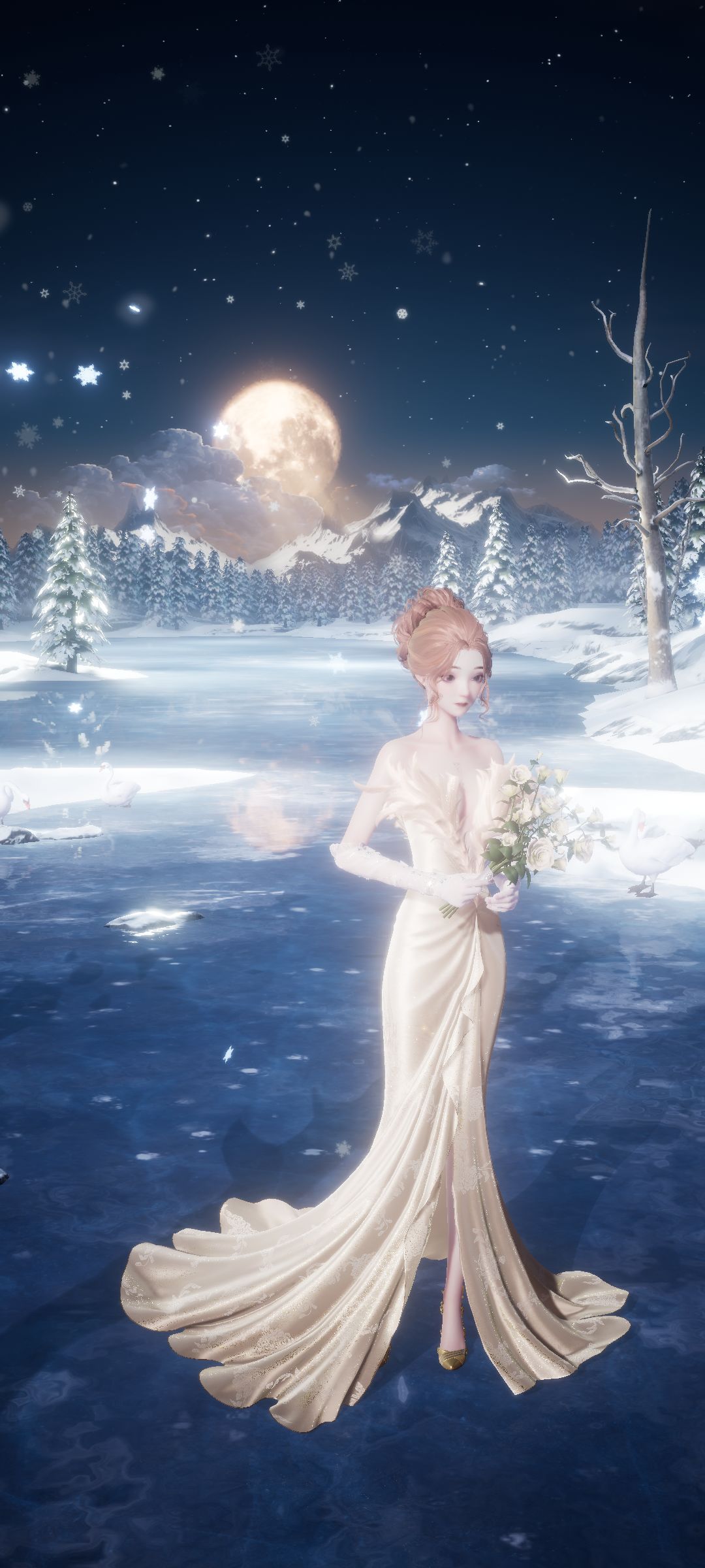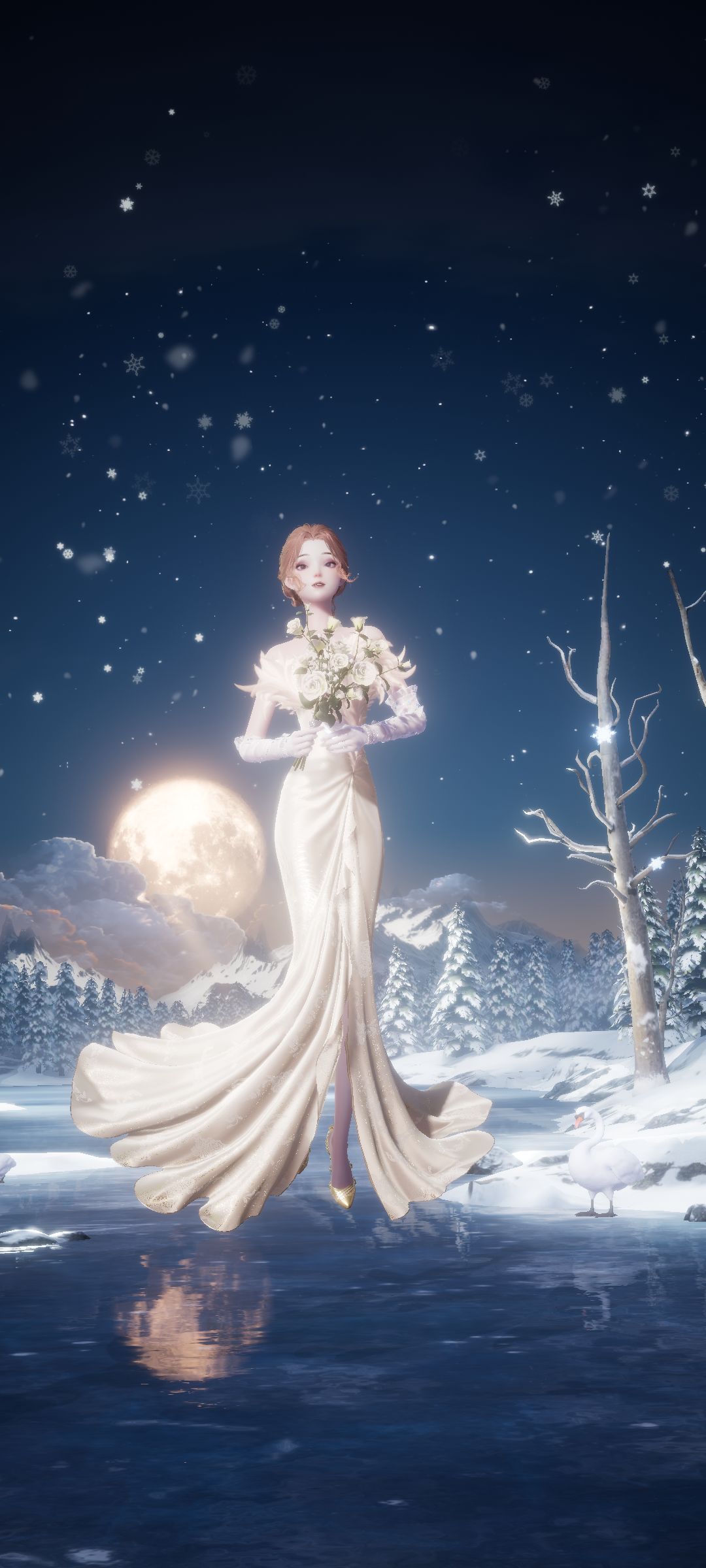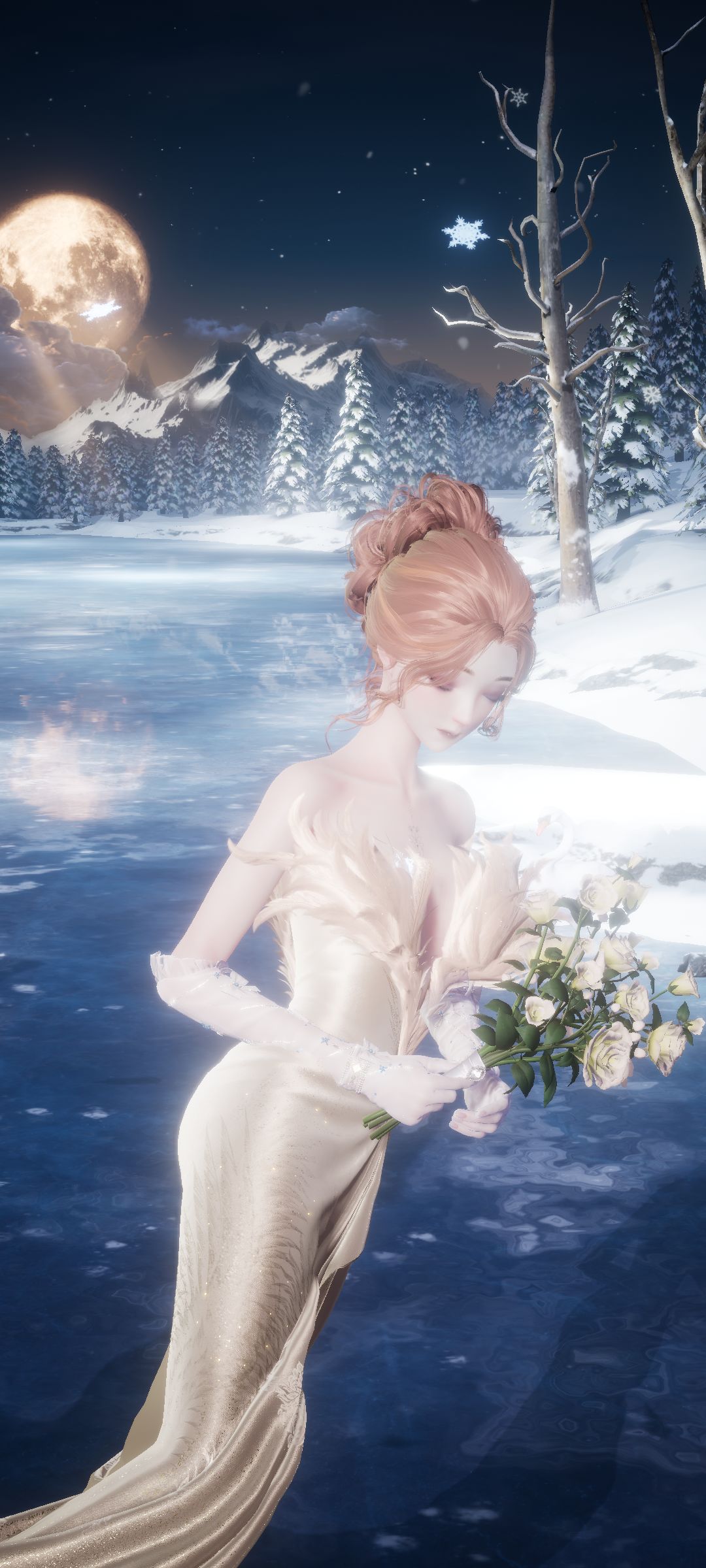 羽毛元素配上优雅礼服,湖光月色之下的她宛如仙子飘落人间。