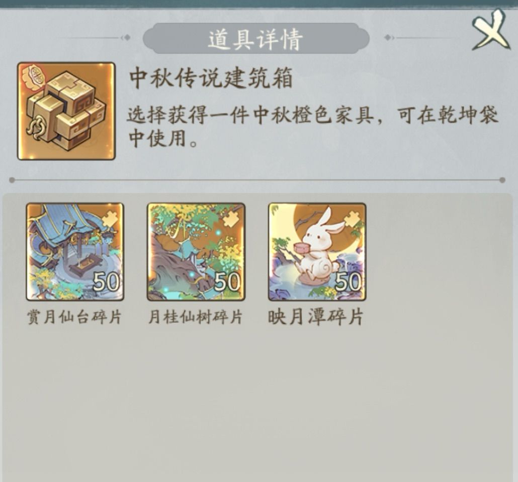 中秋传说建筑箱也于本次活动返场!内含:「赏月仙台碎片」、「月桂仙树碎片」、「影月潭碎片」。