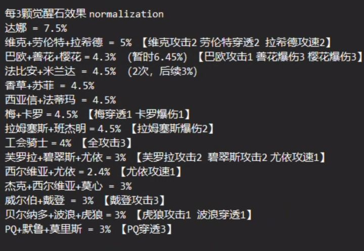 如图是我的情况,大家要结合自己的情况去看。基本的计算就是把所有东西都看3个觉醒星级(15颗觉醒石)能提升多少攻击力,最后评判优先级。举例,对于我来说,达娜缘分从12.5%到25%,只需要觉醒达娜,那么达娜的单位收益(3个觉醒星级)就是7.5%。同理,如果我去觉醒香草和苏菲,因为猎犬已满,所以觉醒他们两个的单位收益是4.5%。那么觉醒其他3人组缘分单位收益就是3%。以此类推,计算出最适合你们的优先级搭配吧!