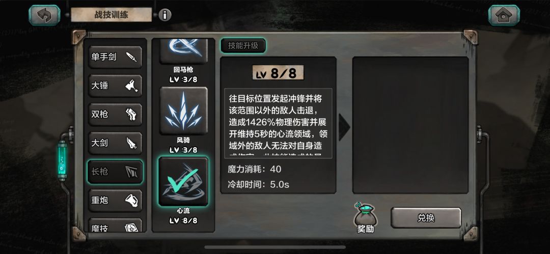 长矛的话,不用说,心流,宁要一级的心流,都不要更高级的其他技能。
