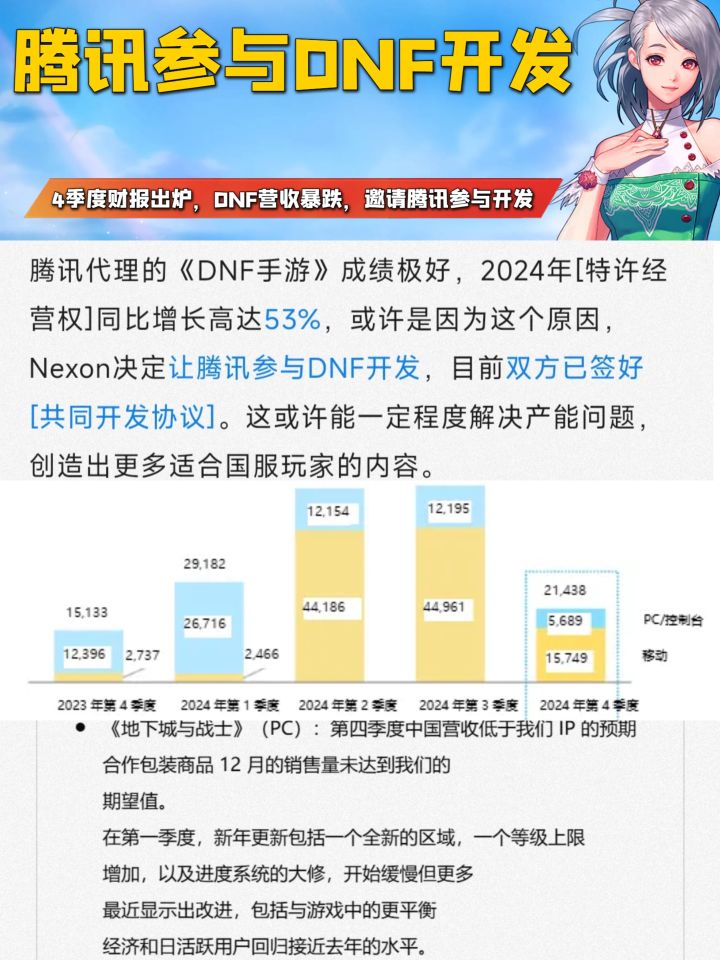 腾讯代理的《DNF手游》成绩极好,2024年[特许经营权]同比增长高达53%,或许是因为这个原因,Nexon决定让腾讯参与DNF开发,目前双方已签好[共同开发协议]。这或许能一定程度解决产能问题,创造出更多适合国服玩家的内容。