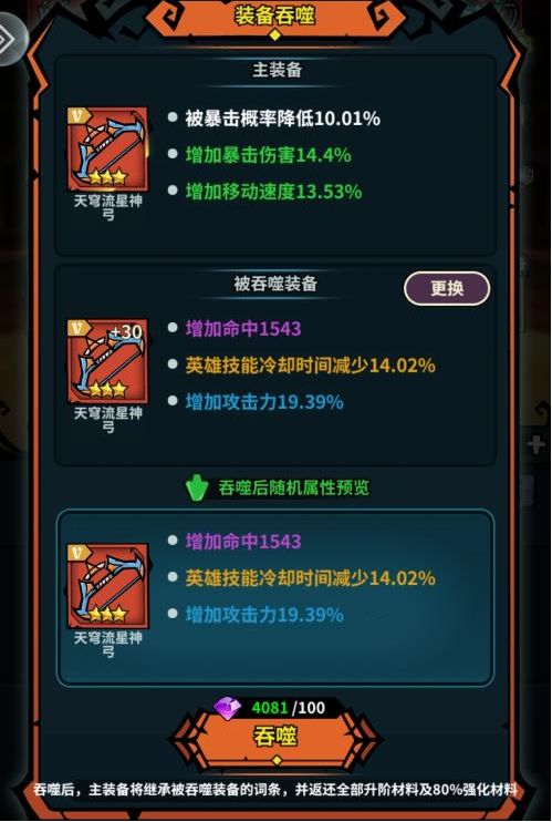 英雄身上已经强化等级很高的装备,当我们有了更好的词条装备后,可以使用红装的“吞噬”功能将新词条替换到已经强化的装备上。