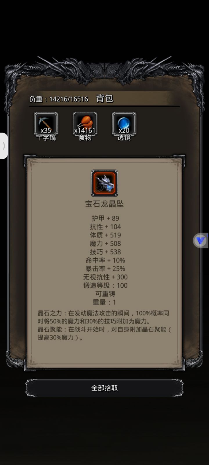 主要角色火法配装:支配/森袍/魔技龙虾⭐/宝石龙晶坠,命中魔力战利品,保底幽风环或满级火环
