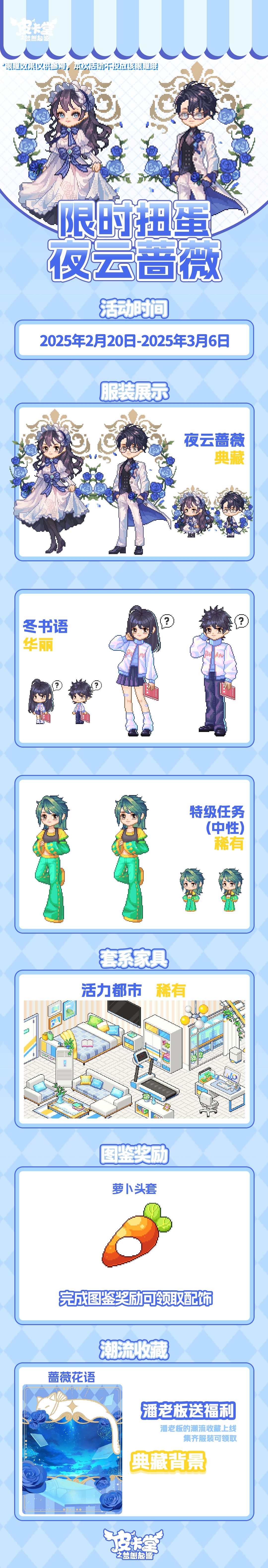 -【限时金币扭蛋】更新!参与可获得典藏套装「夜云蔷薇」、华丽套装「冬书语」、稀有套装「特级任务」,套系家具「活力都市」!收集服装可获得名片背景「蔷薇花语」!完成图鉴收集任务可获得配饰「萝卜头套」!