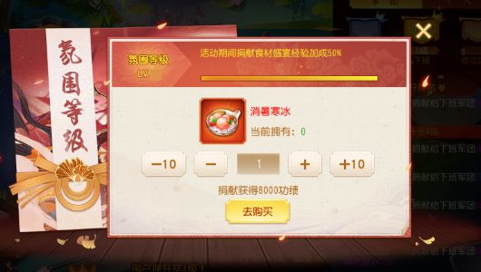 饕餮盛宴热闹不可少,小乔作为气氛组必须到位。氛围道具助力主公盛宴等级再上一层楼,主公捐献[消暑寒冰]可以提升氛围等级,捐献甜蜜果酱、缤纷棉花糖即可获得经验加成,最高可达50%!10级不是梦,快和小伙伴一起参与吧。