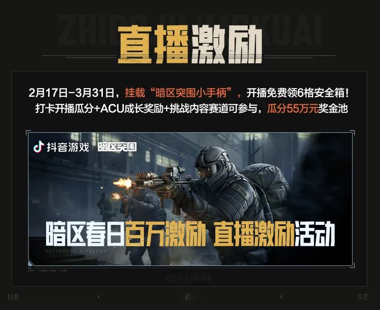 挂载“暗区突围小手柄”,开播免费领6格安全箱,打卡开播瓜分+ACU成长奖励+挑战内容赛道可参与,瓜分55万元奖金池。