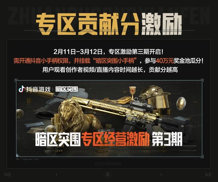 专区激励第三期开启,开通抖音小手柄权限,并挂载“暗区突围小手柄”,参与40万元奖金池瓜分,用户观看创作者视频/直播内容时间越长,贡献分越高。