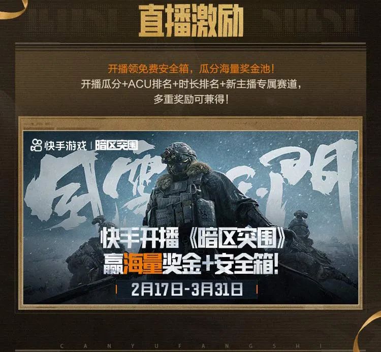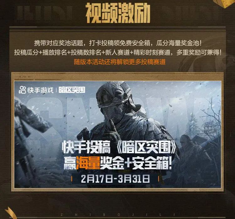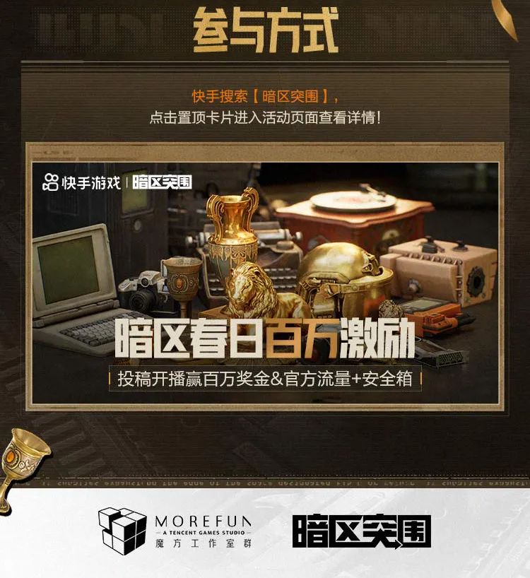 暗区春日开金季现已火热开启,先锋们前往快手、抖音、B站平台投稿暗区突围作品,或开启直播即可参与活动,多重激励内容,丰厚激励奖池等待瓜分,老皮诚邀各路创作者们一起来暗区猛攻!