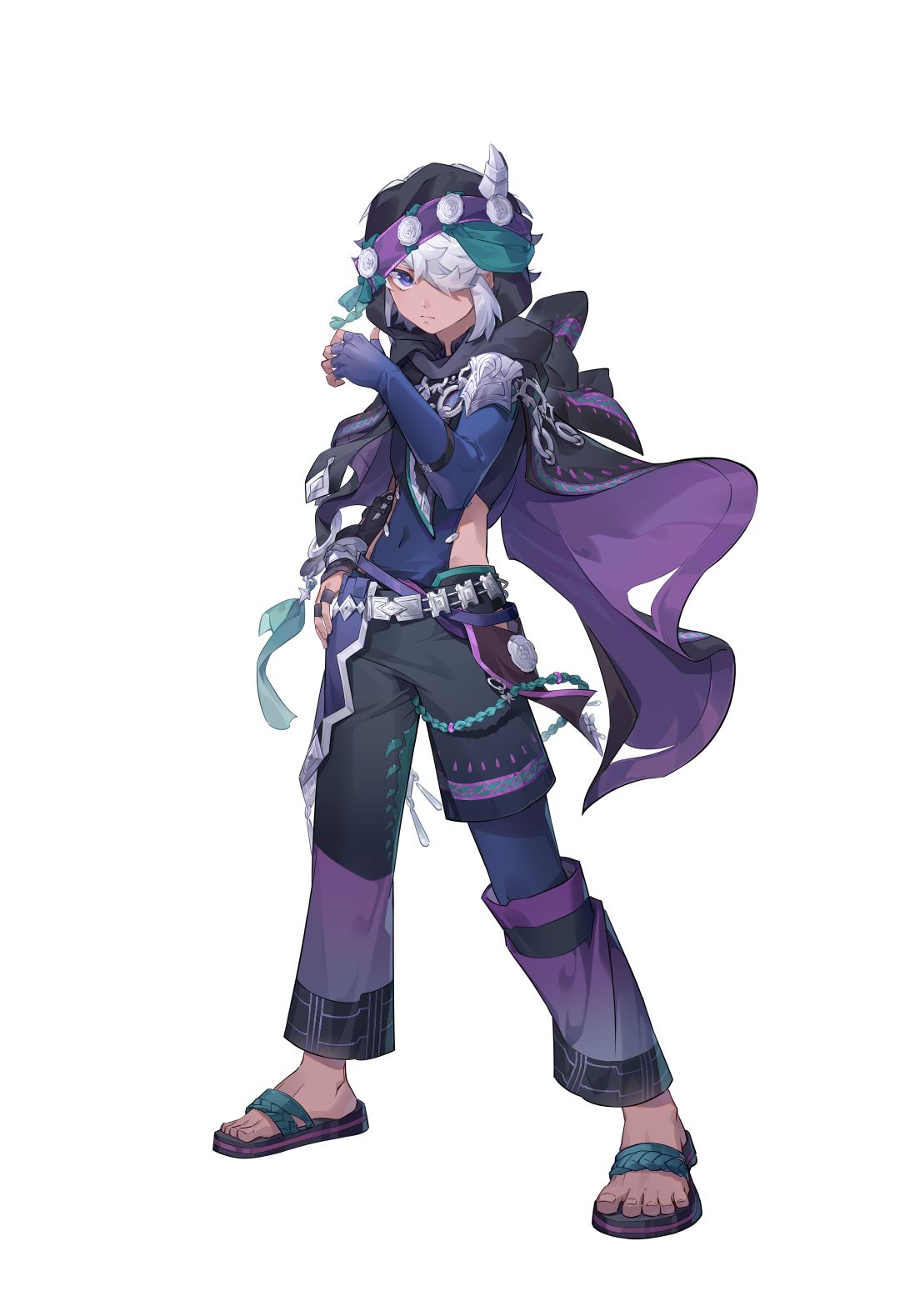 雷雨夜的山洞深处,篝火在潮湿岩壁上投下摇晃的影子。少年蜷缩在兽皮堆成的窝里,银饰臂环与锁链相撞,发出细碎的响动。又一记惊雷劈落,他猛地将头埋进膝盖,苍白的断角几乎要戳破兜帽。少年抬头挑目,异色瞳在火光中忽明忽暗,一只金黄如月,一只幽蓝似渊。“吵死了……”他啐了一口,刀刃上的蛇眼倏然睁开,毒刺锁链如活物般缠上岩壁。