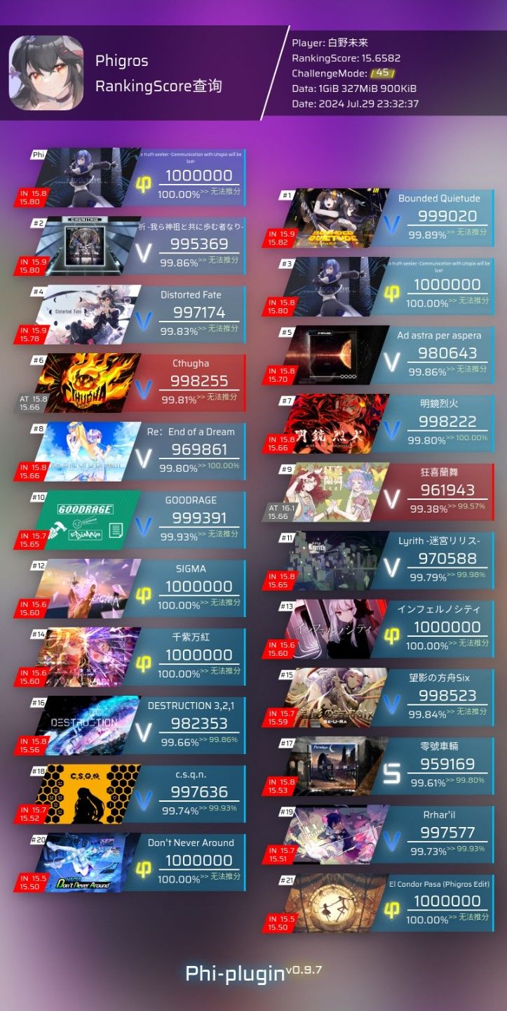 在官方谱师Simon的证实下,我们也正式迎来了全新时代。即如今的“B27+P3”。由单曲rks最高的27张谱面与3张最高定数AP谱面组成的新Rks体系诞生了。