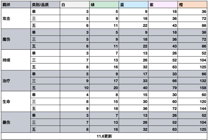 (注:羁绊参与相关技能及光环叠减,但羁绊本身数值不变,只有技能叠减,例:龙枪的龙魂与爆伤羁绊,海潮的生命光环与生命羁绊)