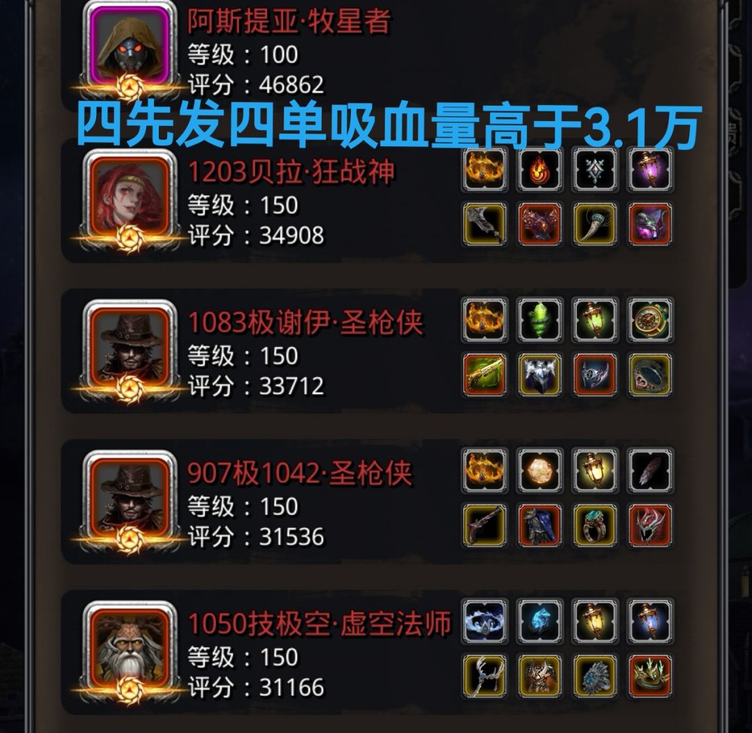 图4是我的队伍配置,有2队,四先发四单吸,血量大于3万。