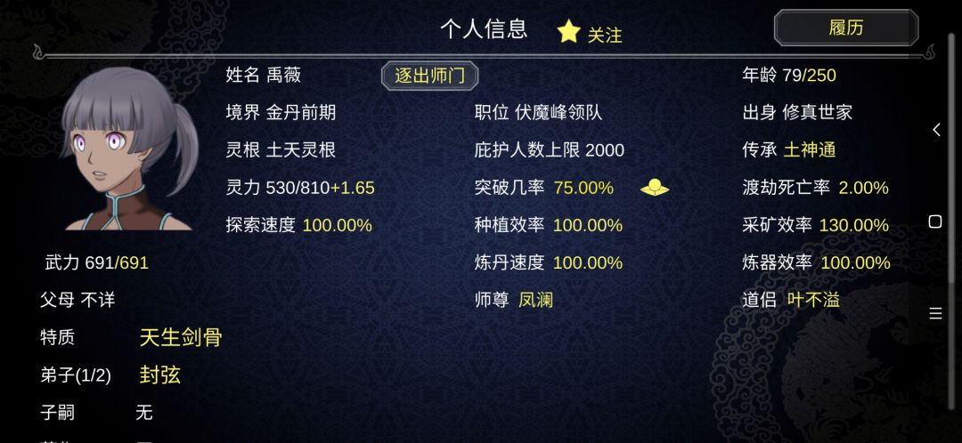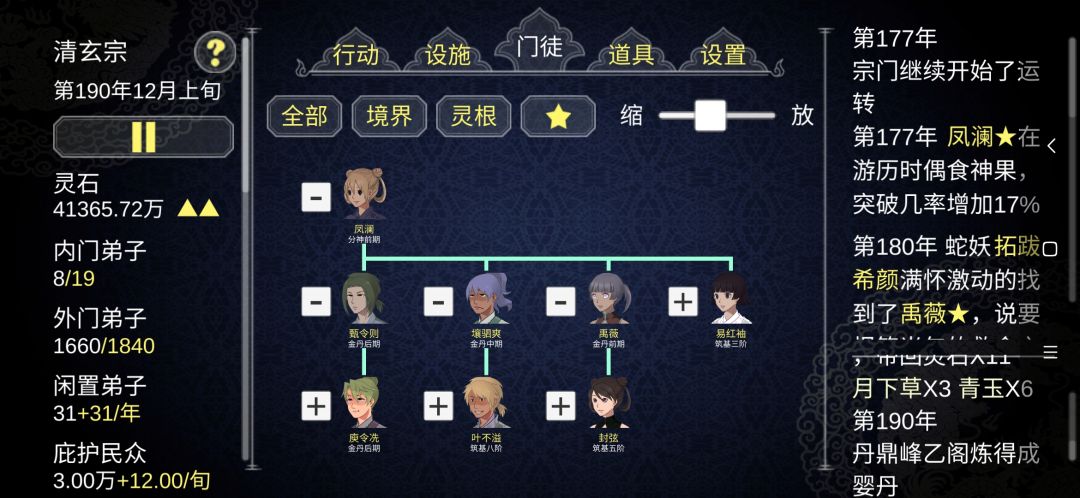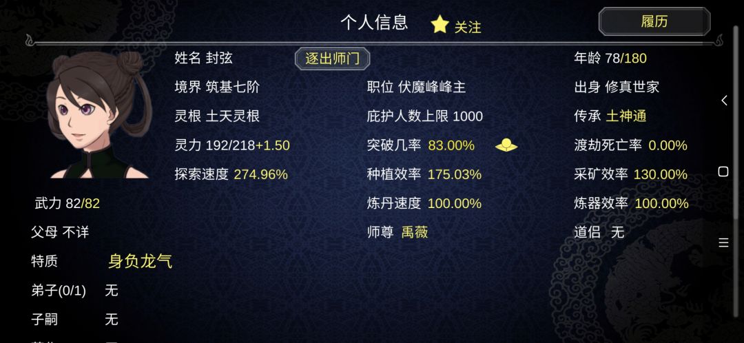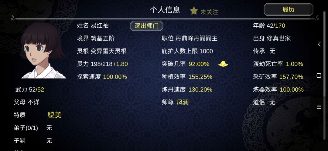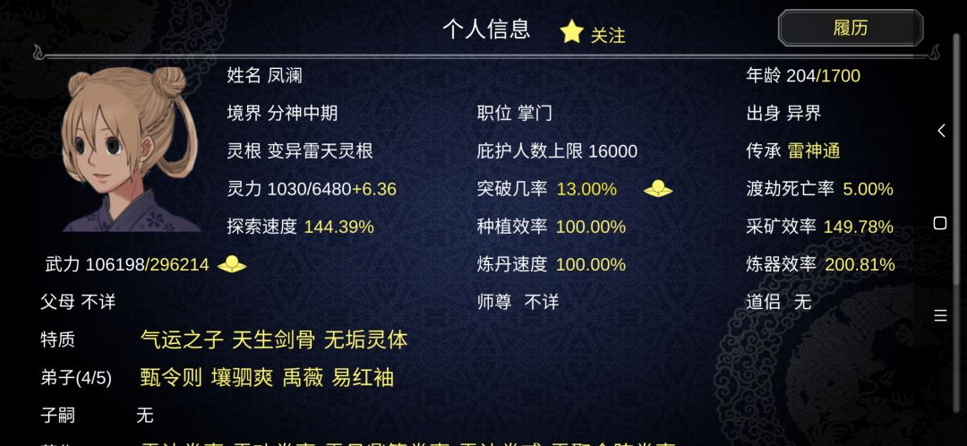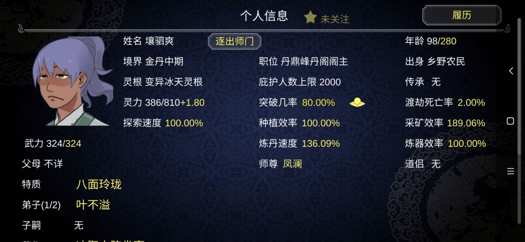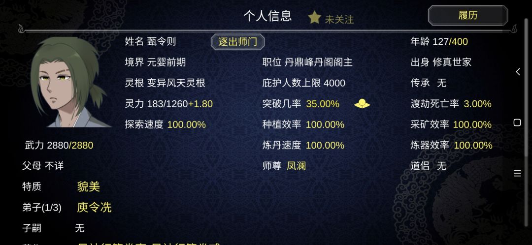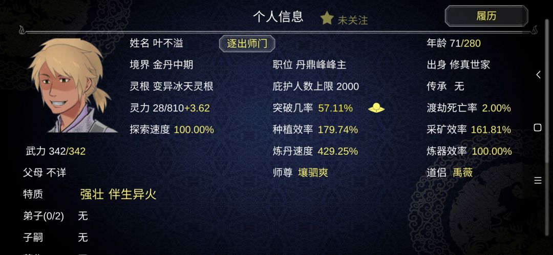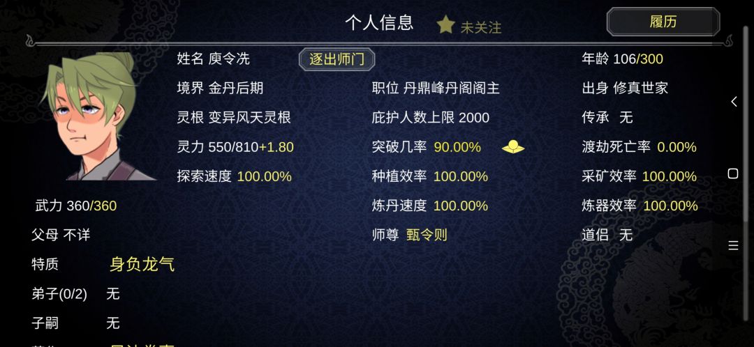二周目,高颜值开局,极品特质,全天灵根(包括变异),同属性传承分支(飞升不会断传承),3个传承神通都是100以上武力加成,内门弟子贵精不贵多,灵石一直是正的,药坊各种丹药也不间断,准备这局全员飞升。开局方法下面回复。