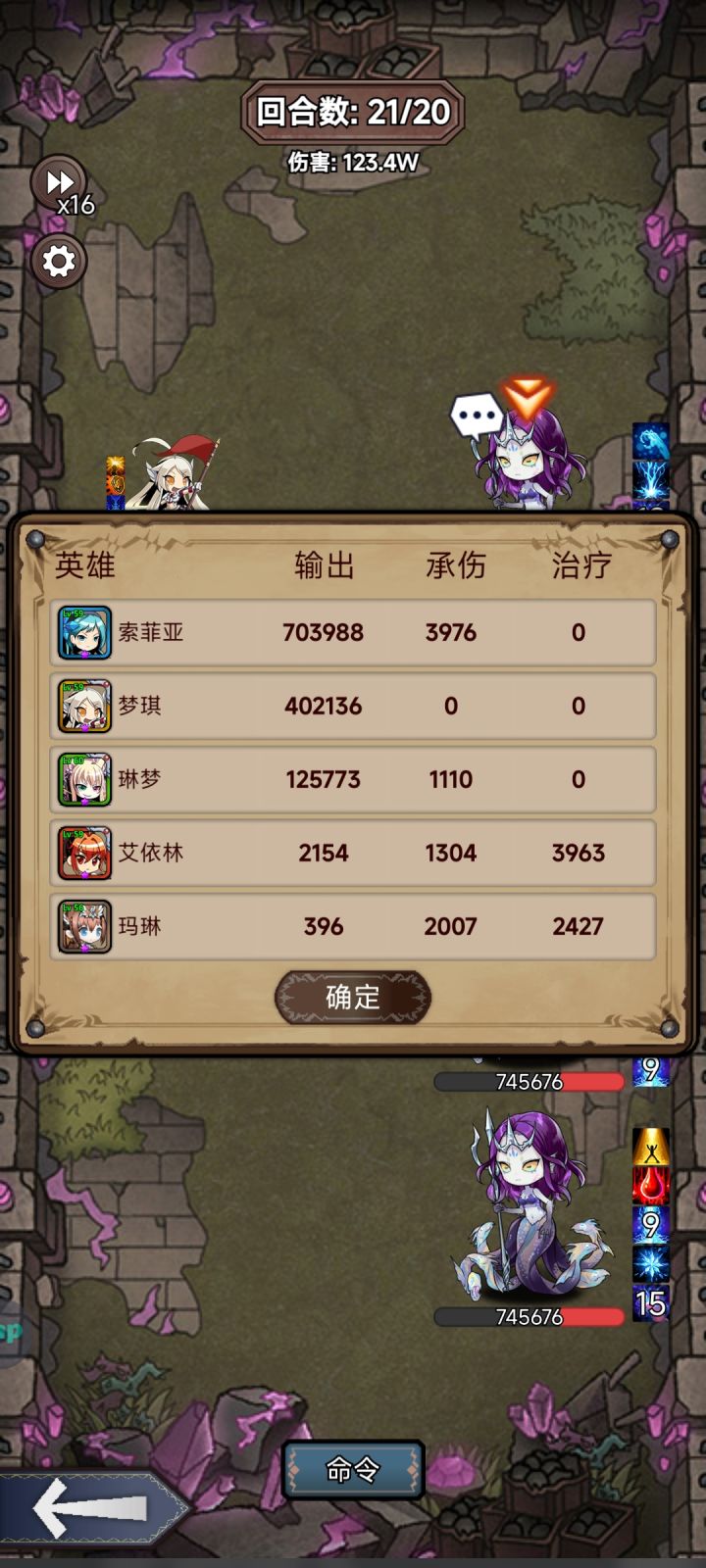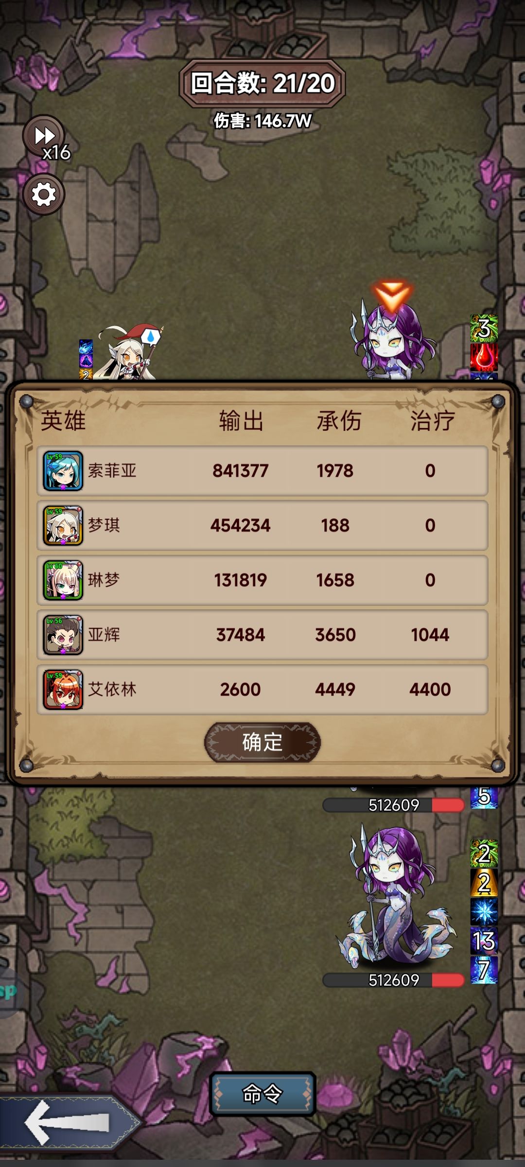 ——相比其他BOSS,生存压力较低,如果有生存风险,建议开低倍速,避免特效遮住血量条。海妖高法伤在开局,高物伤在5回合之后(冰法偷法伤),注意被沉默的海妖普攻到脆皮没有,然后嗑药就行