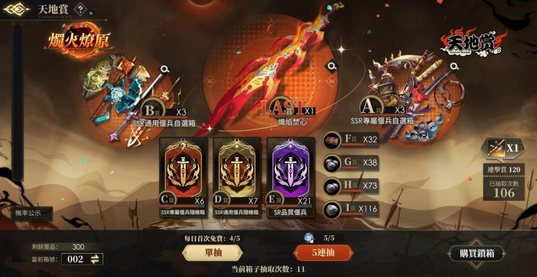 ※单个天地赏箱内赏品剩余数量<100时,新增抽取条件:需在当前箱内至少抽过10抽