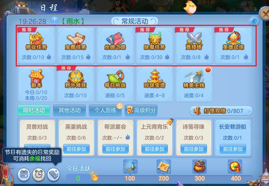 我们每日上线需要需完成【日常任务】,一般推荐上面这一排的任务,比较省时间。