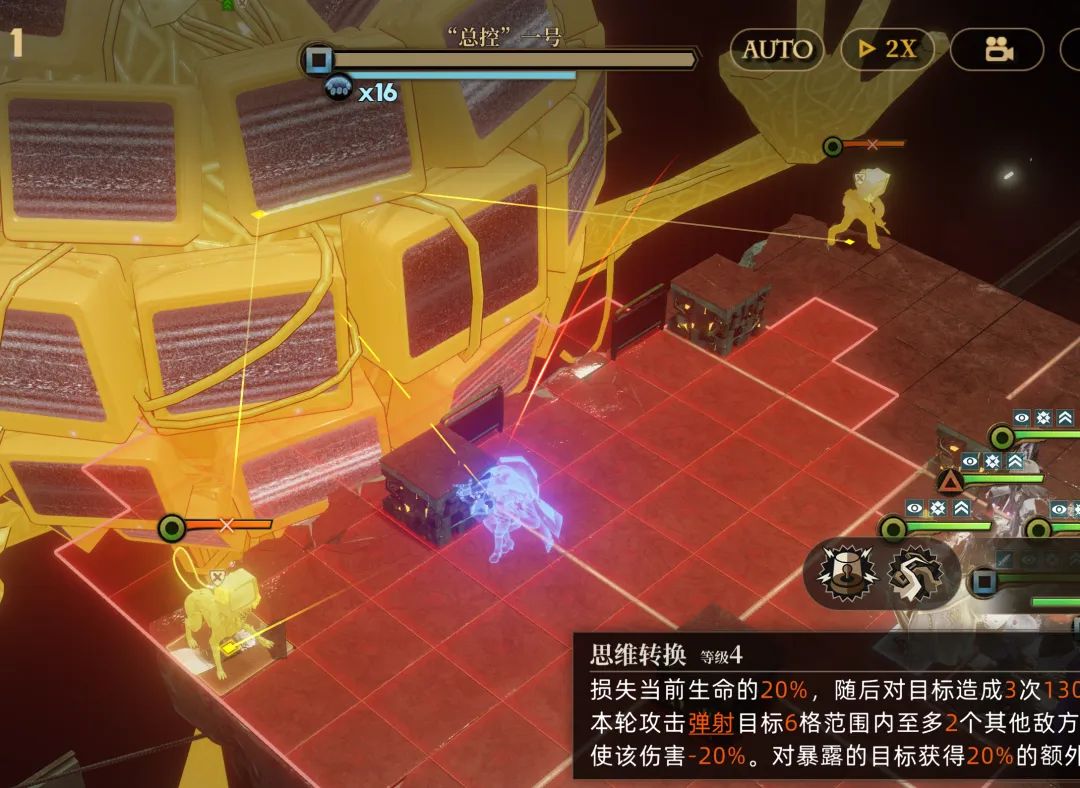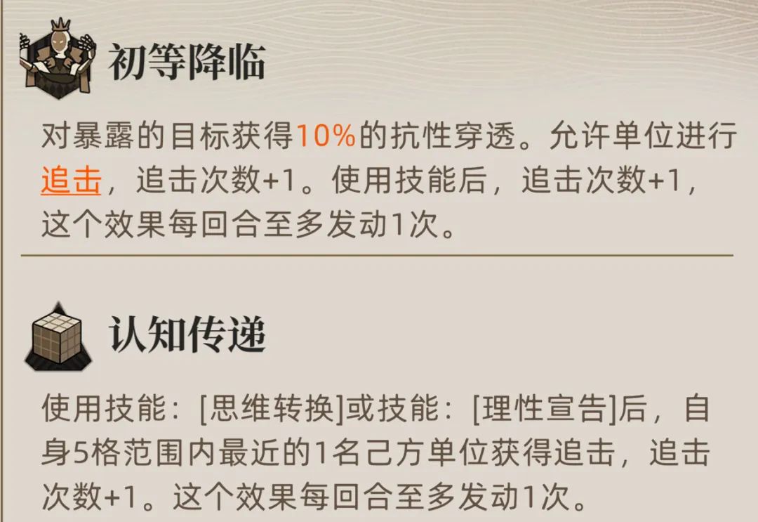 而第二个特性“认知传递”则是在使用双技能后可以使自身周围的某个友方获得1次追击,这个效果也是每回合只能触发1次,大家在利用这个效果时需要注意友方的站位,不要把宝贵的追击机会给到输出较低的角色了。
