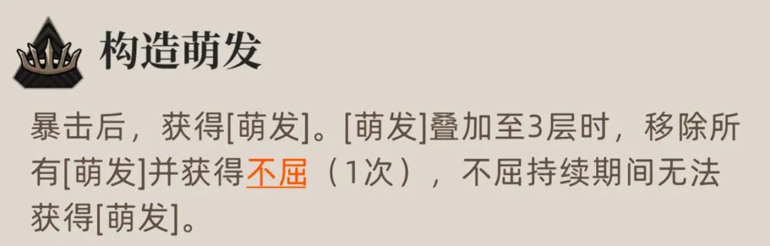 最后一个特性“构造萌发”则是给予了库珀一个定向不死的能力,而其中这个在暴击后才能触发的“萌发”状态,每回合的伤害不管有多少段暴击都只能获得1层,这就相当于在常规战斗状态下,库珀需要3回合才能触发1次不死,当然如果有瑛美的再动等辅助的话,库珀也可以单回合内实现2层“萌芽”的积累,这些细节大家可以注意一下。
