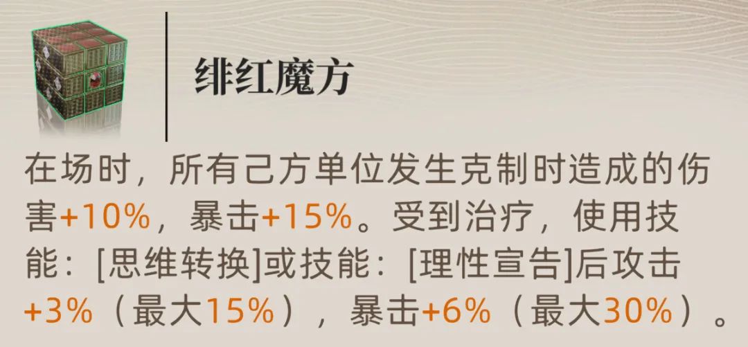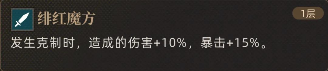 - 每受到1次治疗后都可以积累1层,相当于瑛美如果单回合使用2技能治疗1次的话,其就可以单回合给库珀积累2层绯红魔方buff