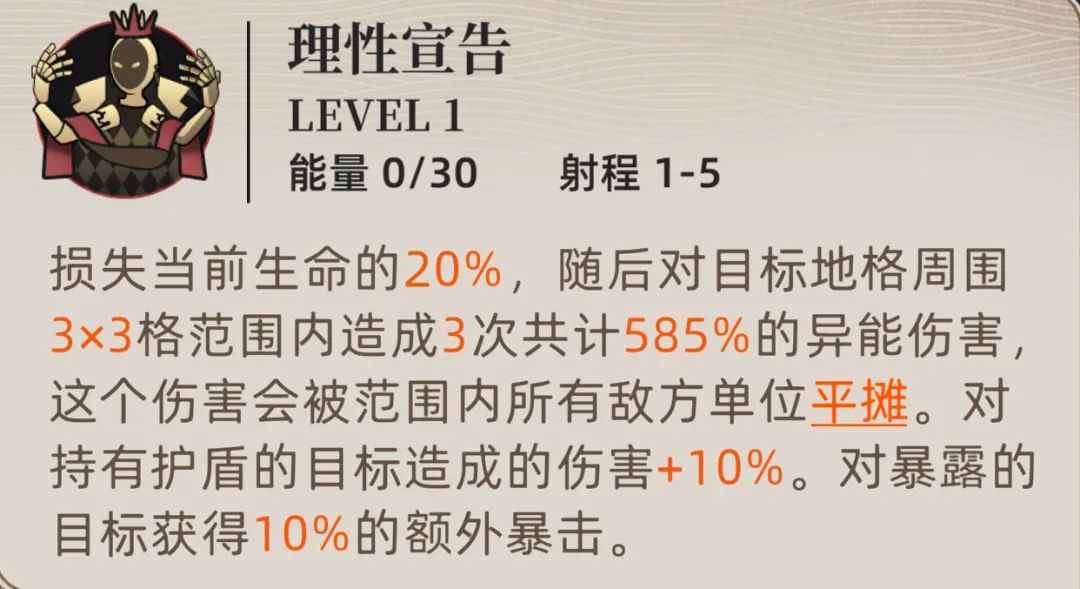 接着库珀的2技能初始能量为0,使用后依然会损失自身20%的生命,随后可以对敌方3×3的范围造成3次范围攻击,总伤害为585%,其中所有的敌人会平摊这个伤害,这个平摊和安妮塔的“分担”机制并不同,其就是均摊的意思......且这个技能对于护盾敌人还能额外增伤10%,对于暴露的敌人也有10%的额外暴击加成。