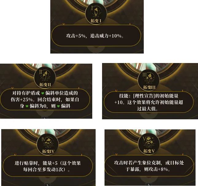 接着库珀的拓变效果可见上图,经过实测大概在吃满每回合2次追击后,如果库珀的回合内用的是普攻,则拓变1大概可以给到其单回合的总增伤约为7.6%左右,而如果库珀回合内使用的是1技能或2技能......则这个拓变1的综合增伤幅度也会大幅下滑,比如维一用1技能打到3个敌人的情况测算了一下,拓变1能带来的总伤害增益就会被稀释到只剩3.7%左右,所以这个拓变1的效果大家可以参考一下以上数据。然后拓变2的这个增伤就是条件性的增伤了,且提升库珀自己的生存能力也是需要视具体的战斗环境而定的,因此维一个人经过实测后的感觉是,大部分普通玩家在0拓变下就可以用了,高拓变所带来的成本压力大家也是需要考虑的。那么这里也简单总结一下库珀的抽取价值,经过实测维一个人认为库珀作为一个法师而言还是具备很强即战力的,且由于她的爆发力较强,在很多队伍中都可以作为主C上阵(例如暴击队等主流队伍),当前的抽取价值属于很高的范畴,不过大部分玩家抽个0拓变暂时也就够了,最后具体的队伍搭配和配件等内容咱们留到明天的详细攻略中再细聊吧。
