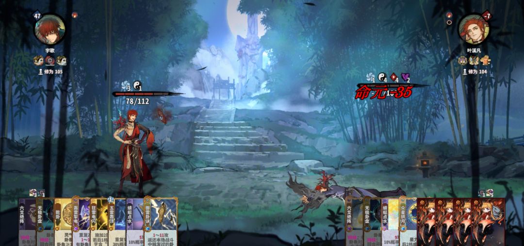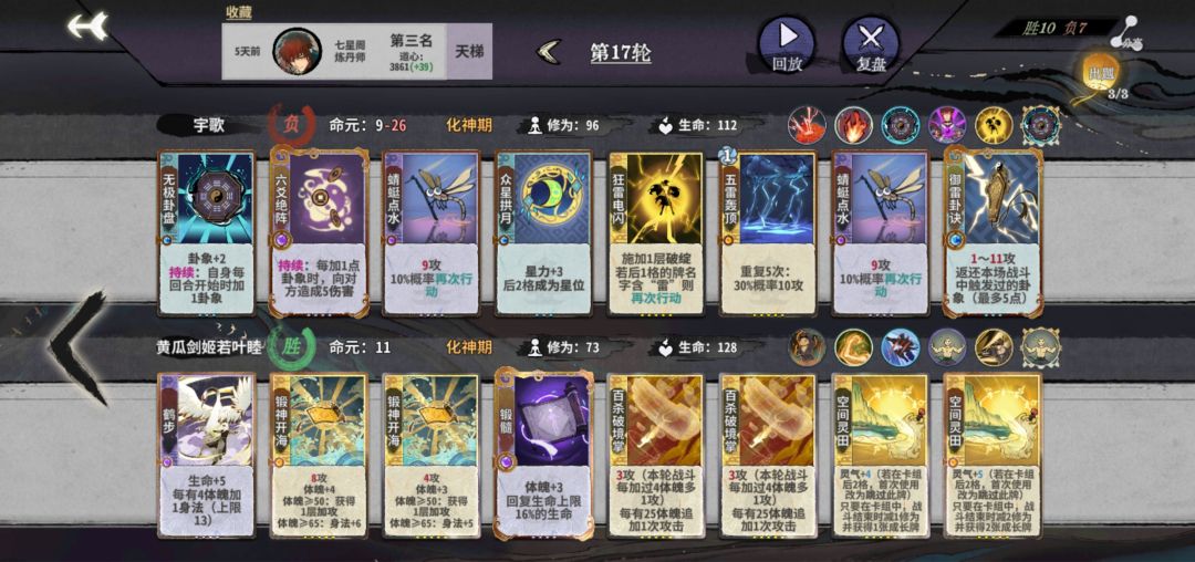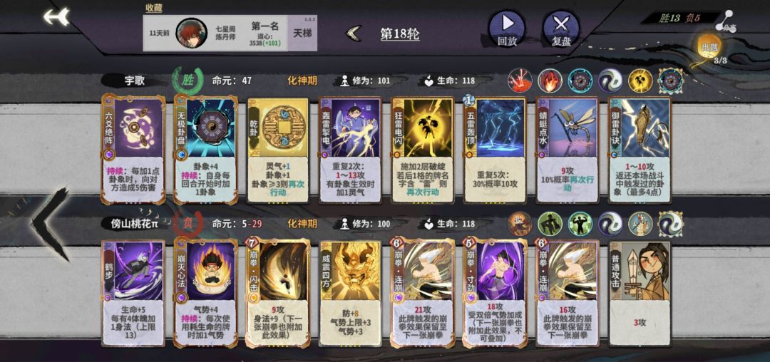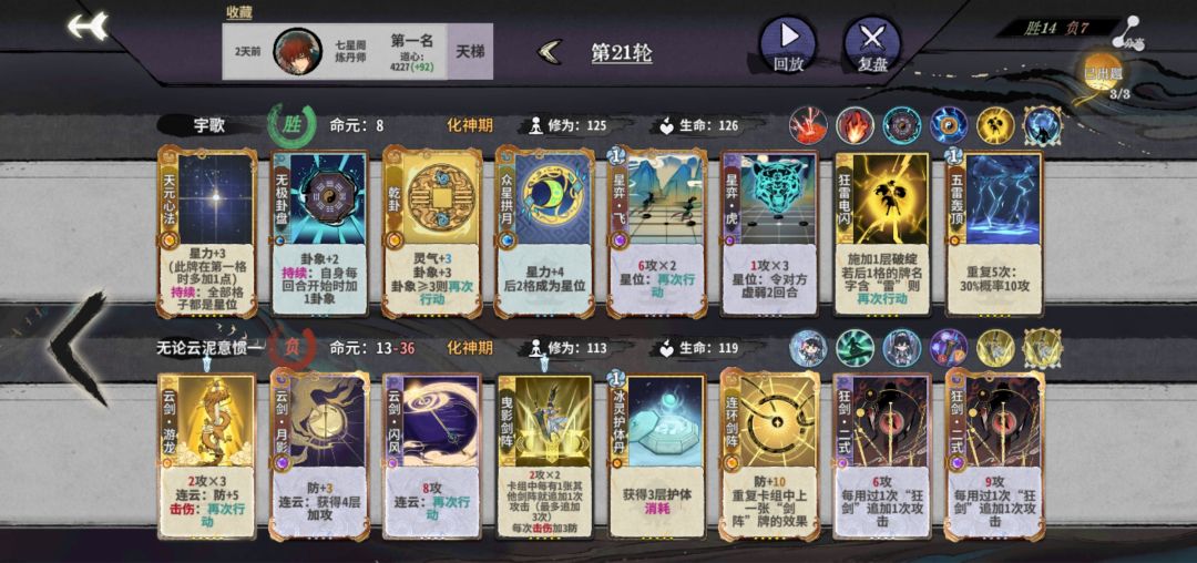 筑基开始,拼先手也拼质量,牌质量不行,先手也没用。这回合一定注意要留两个双击牌,不然下轮亏星力攻击。公式中1、2位置看对面攻击牌应对调整。
