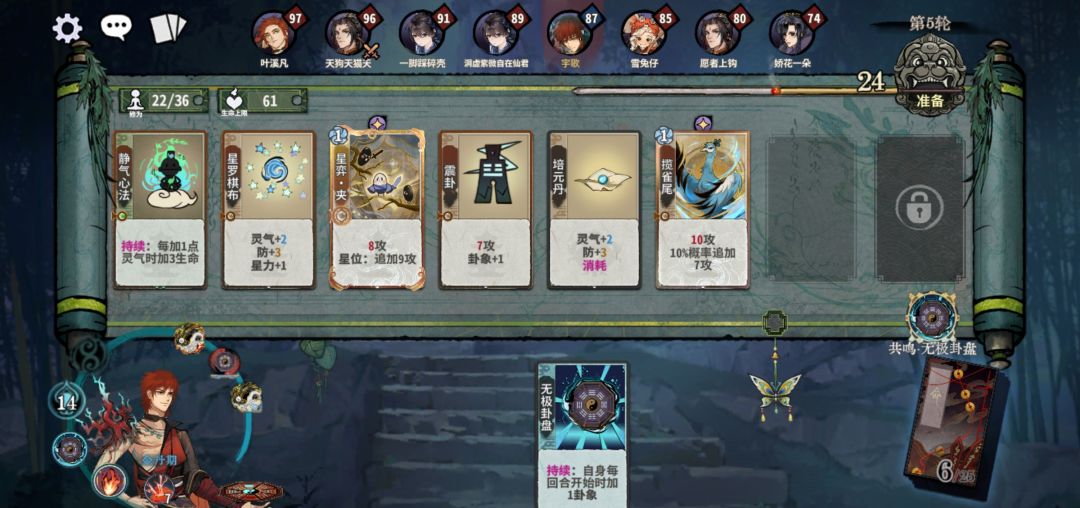 2. 稳定:弈仙牌的游戏机制中,运气占一定比重。有无极共鸣后,元婴期和化神初期,都是强势时期。化神期,哪怕没有天元、五雷等强力卡牌,有张六爻也能抗住压力。通常情况下,炎尘只要在20抽中,随便抽到一张关键牌(key牌),就能稳住局势,这是其他职业难以做到的。