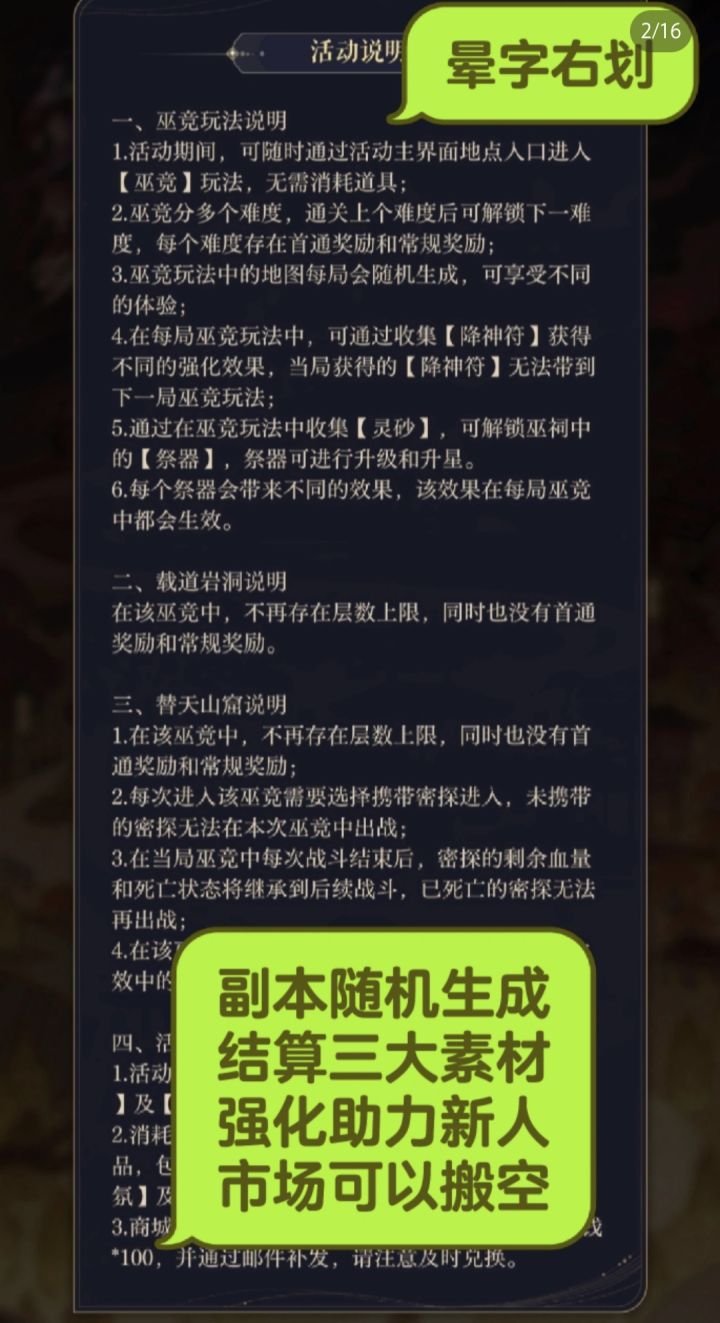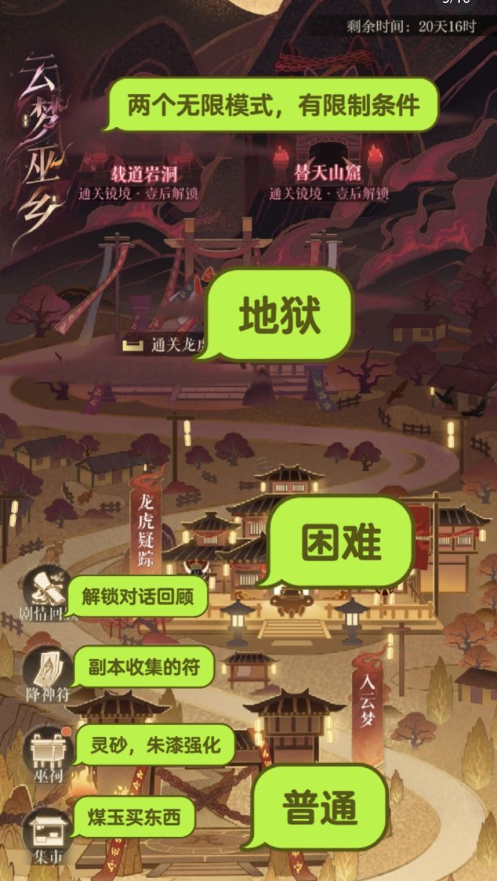 游玩选择分:入云梦-龙虎疑踪-镜境三种,难度递增,虽然刷最低级也能搬空集市,但巫祠中有些需要高级副本才能开启,这点需要⚠️注意(可能会卡新手)