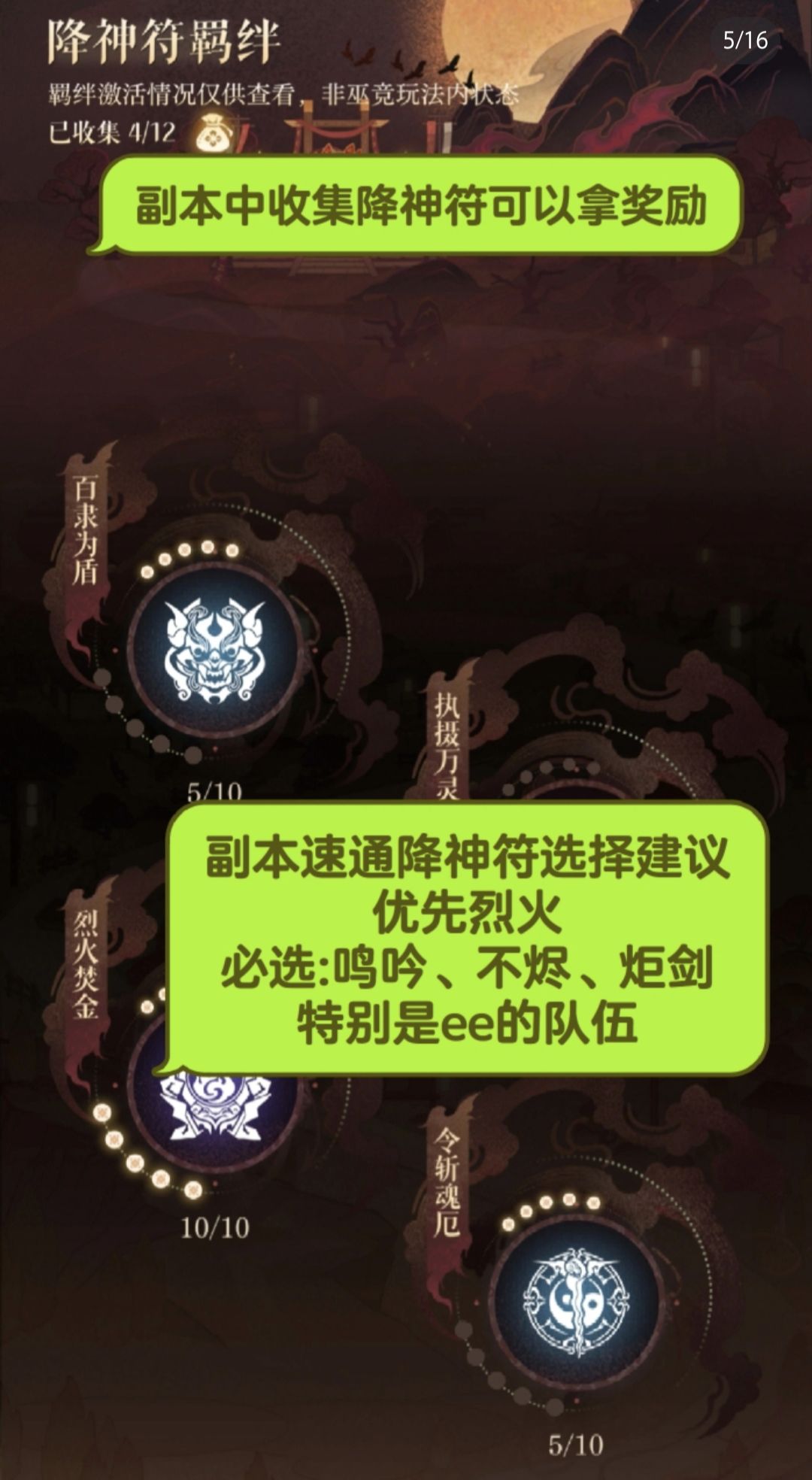 副本中降神符的选择建议收集一个类型为好,这样可以