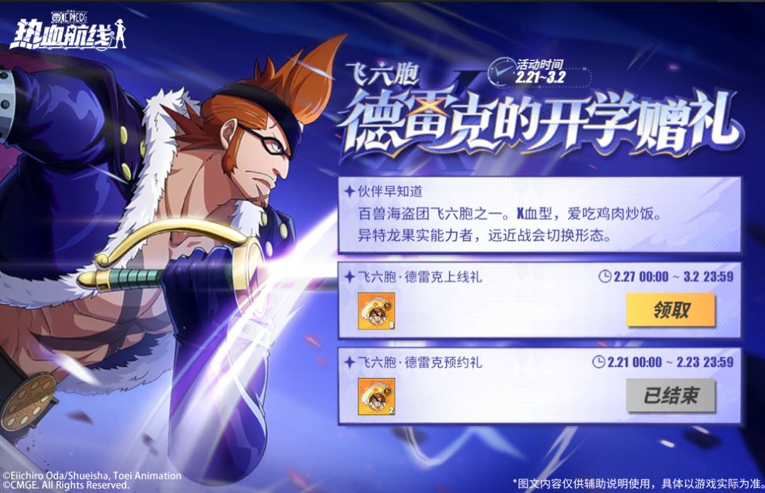 -2月21日0:00至2月23日23:59期间,船长们登录即可领取飞六胞·德雷克预约礼,奖励包含2张飞六胞·德雷克限时召唤券!