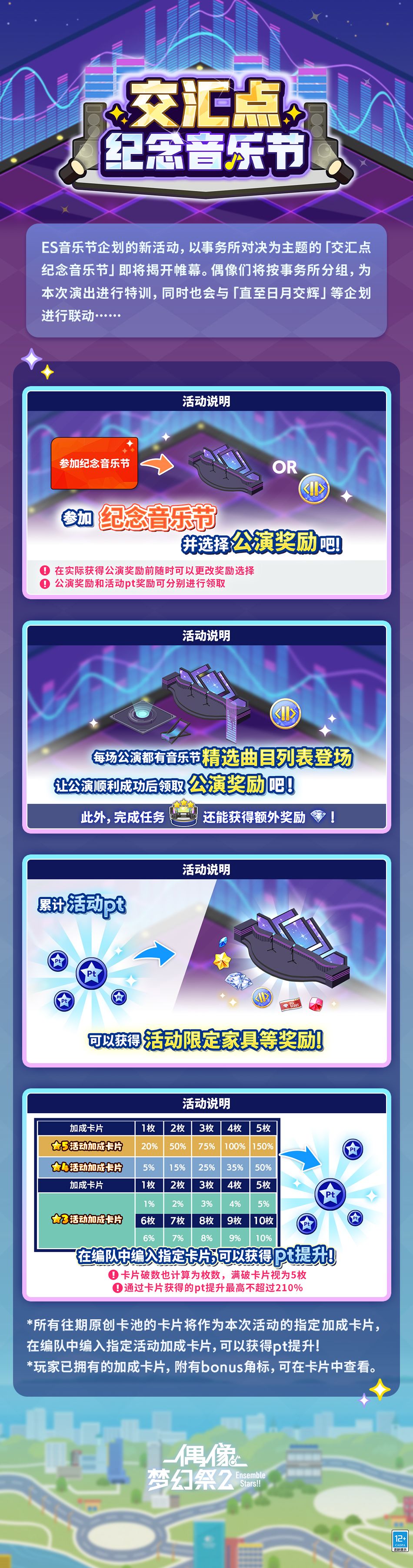 ※参加纪念音乐节并选择公演奖励,每场公演有音乐节精选曲目列表登场,完成相应公演数量可获得选择的活动回忆硬币、活动限定家具奖励,还可解锁活动迷你对话奖励!
