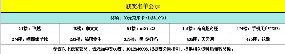 恭喜以下幸运的玩家获得活动奖励,请中奖的玩家添加获奖群:1012646096,请加获奖群后,登记相关获奖信息,超过15个自然日未进群未登记视为放弃奖励~