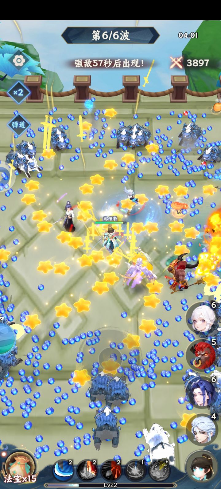 三神技,万剑诀,离火剑,飞花剑(需搭配嫦娥食用)。相比菩提剑气,万剑诀操作简单,兼顾对群,适用伙伴多,新手期不二之选。离火剑强在20级宝典解锁的几率混乱,三秒碰撞无伤且怪会回头,这游戏前期能获得控制就三个,姜子牙,雷震子,离火剑,谁不希望怪撞在身上时候手机不振动呢,又有谁不希望boss扔技能的时候突然原地罚站呢。飞花剑赌狗专用,前期牛魔王也清不掉小怪的时候就到飞花剑出场了,嫦娥配合局内法宝飞花剑连续释放以及数量增加,清场神技就出现了,图一正常嫦娥6级飞花剑,图二完全体飞花剑,图片不能完全展现清屏效率,用过都说好,缺点是赌不出局内法宝这把基本就炸了,普通飞花剑狗都不玩。