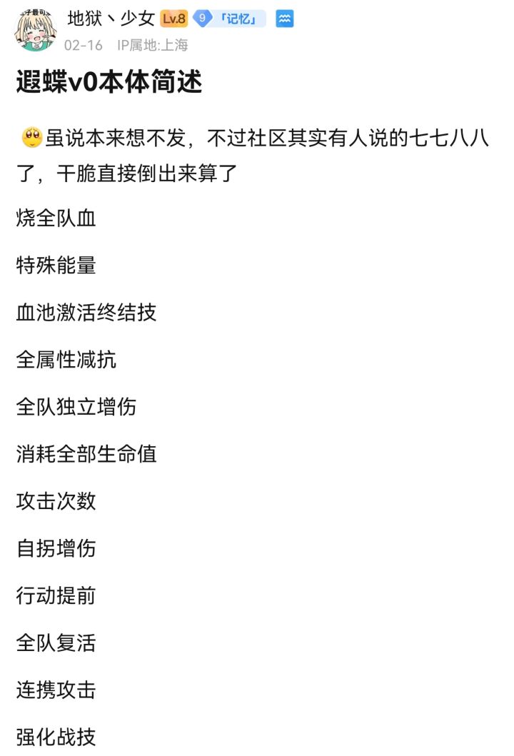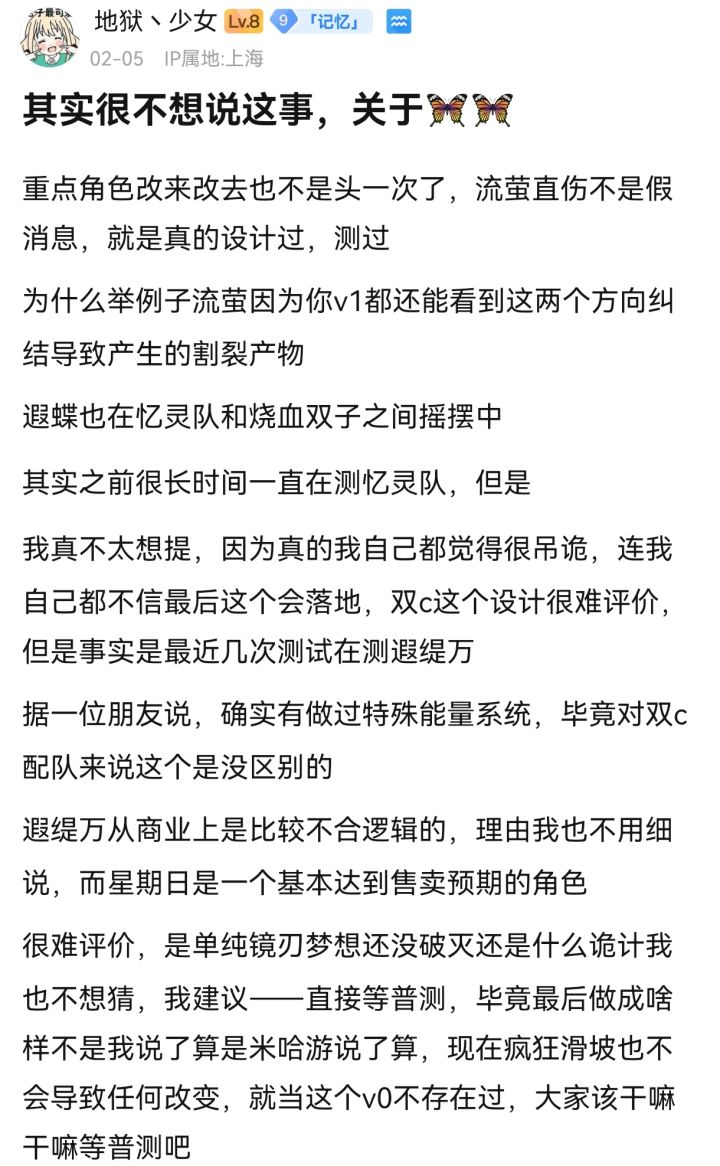目前来看万敌出来以后暂时的最佳配队是万敌缇宝星期日罗刹,星期日明显万敌是吃不满的所以不会是万敌的最终队友,如果遐蝶的技能机制真是图一那样就很适合跟万敌一队了,这样如果后面的风堇也是生命奶那和瑕蝶万敌缇宝组成生命大队也很合理。就是万敌和遐蝶的受众人群重合度很低,一个周年庆角色绑之前的角色让周年庆回归的玩家怎么办?所以我觉得要绑也不会深绑,可能也是黄泉那种星魂解锁配队的套路。