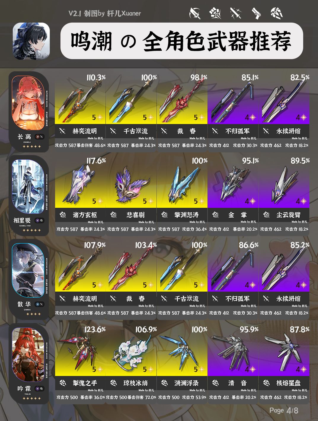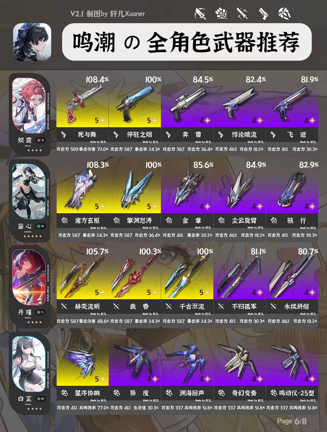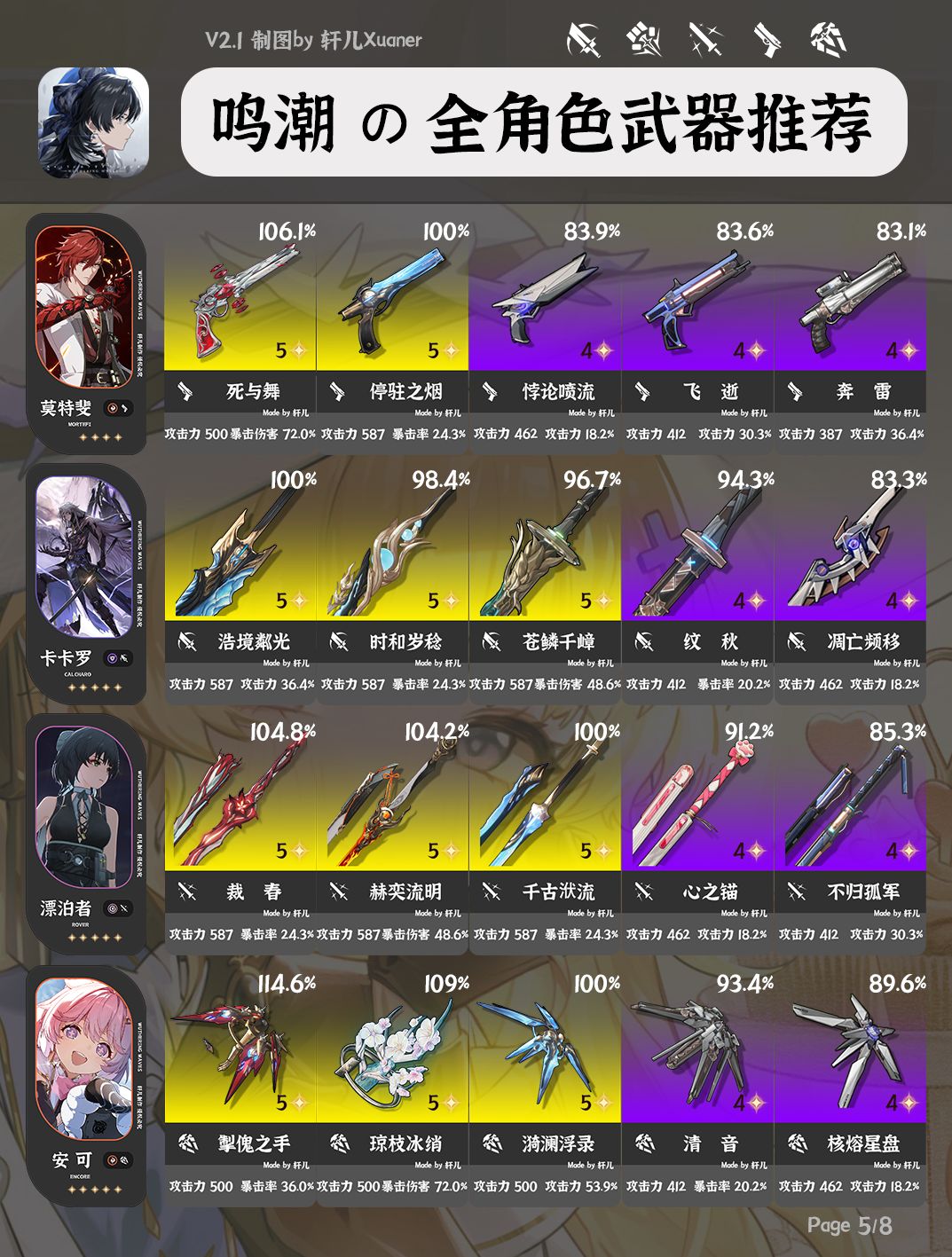 ①每位角色推荐5把武器,按照优先级排序