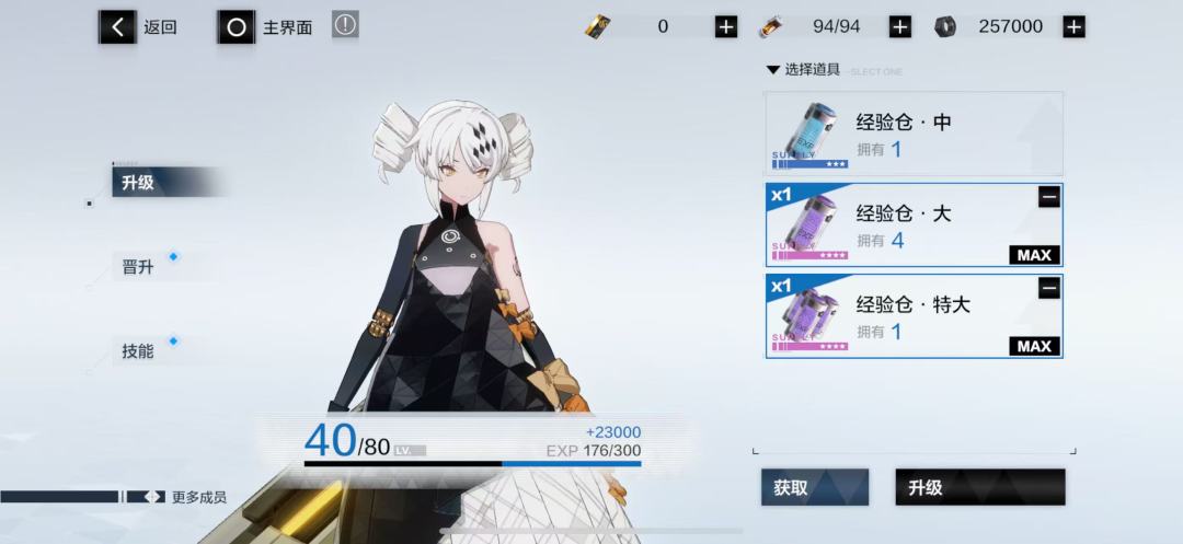 • 等级提升:消耗经验仓提升角色等级。
