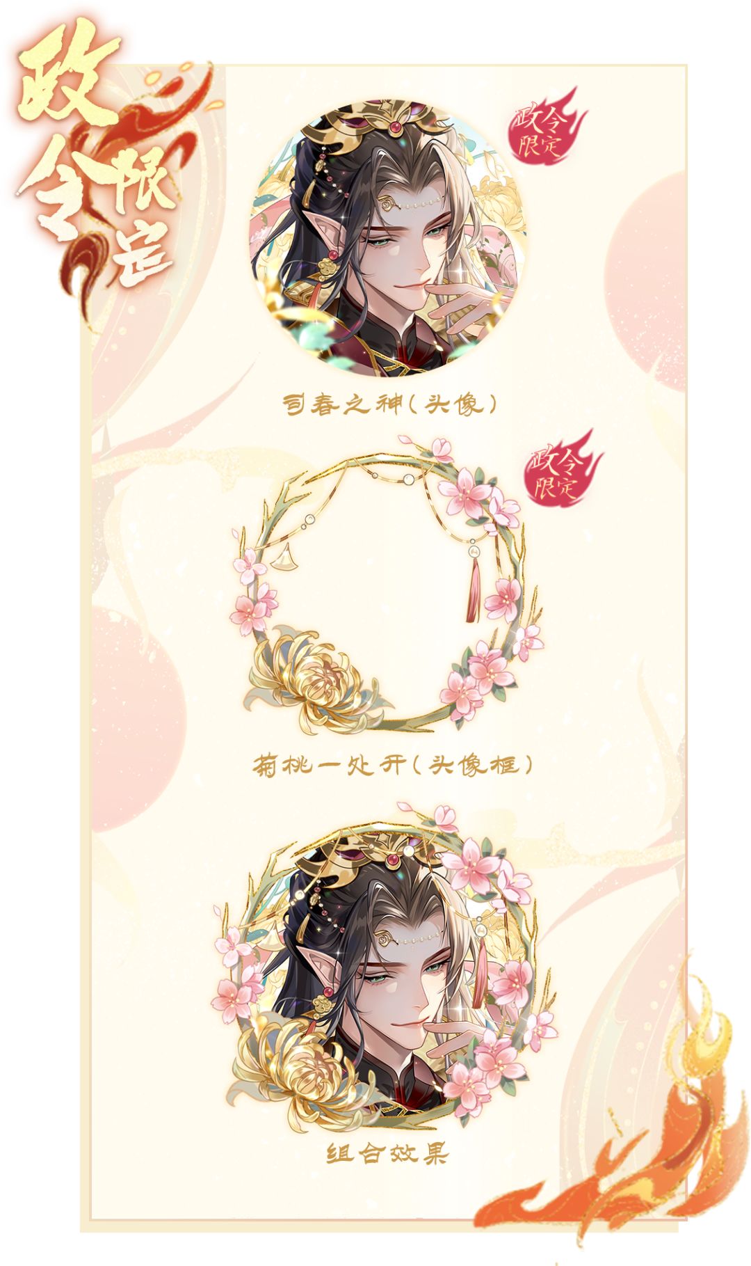 新的一期上凰政令将于2月24日00:00至3月23日23:59开启,提升政令等级,购买进阶方案,有机会获得全新头像“司春之神”,头像框/气泡框“菊桃一处开”