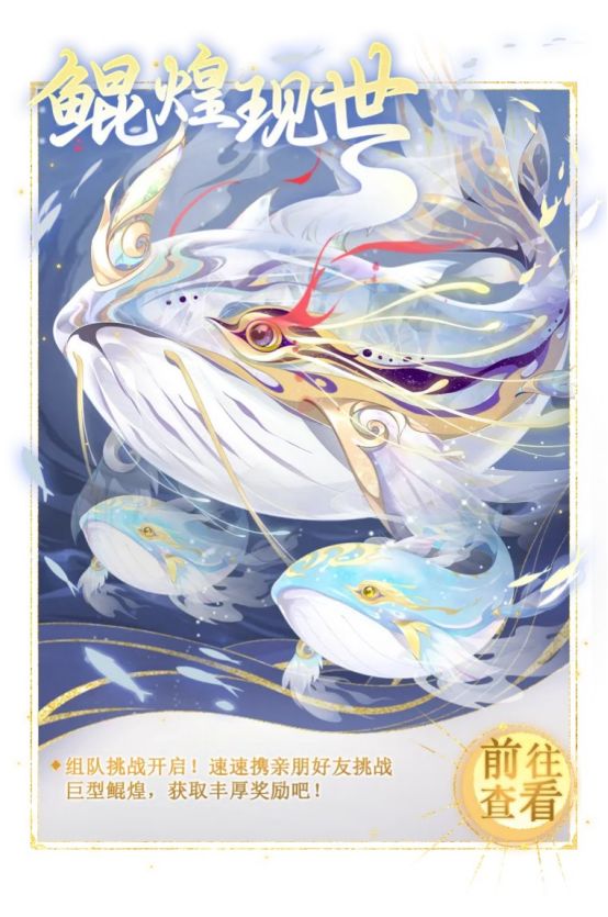 4、鲲煌会携带两名云鲸同时进入战斗,需全部击败后方可通关;战斗结算时,根据击败云鲸数量、首领减少的血量、是否击败鲲煌获得固定道具银币、绿头签等奖励;若鲲煌和所有云鲸均被击杀,则会根据挑战难度额外获得奖励道具鲲煌组队随机宝箱;同时会展示本次的战斗评分,单场战斗中,己方单位出手次数越少,战斗评分越高