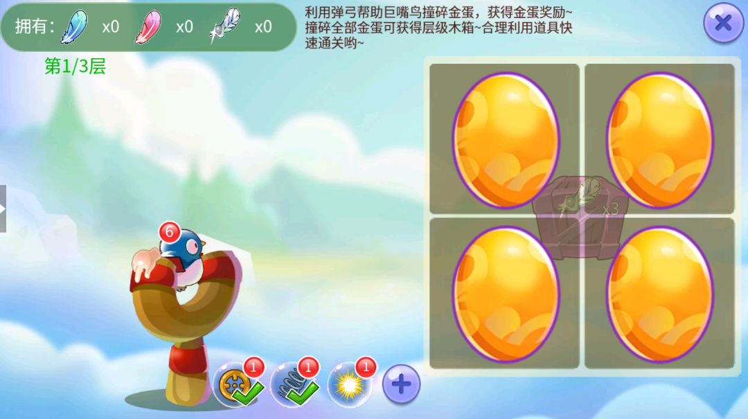 拉动弹弓上的巨嘴鸟撞击金蛋,过程中可收集羽毛,注意下方可以选择辅助道具~