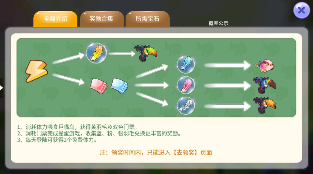 目标:收集双色门票、黄色羽毛