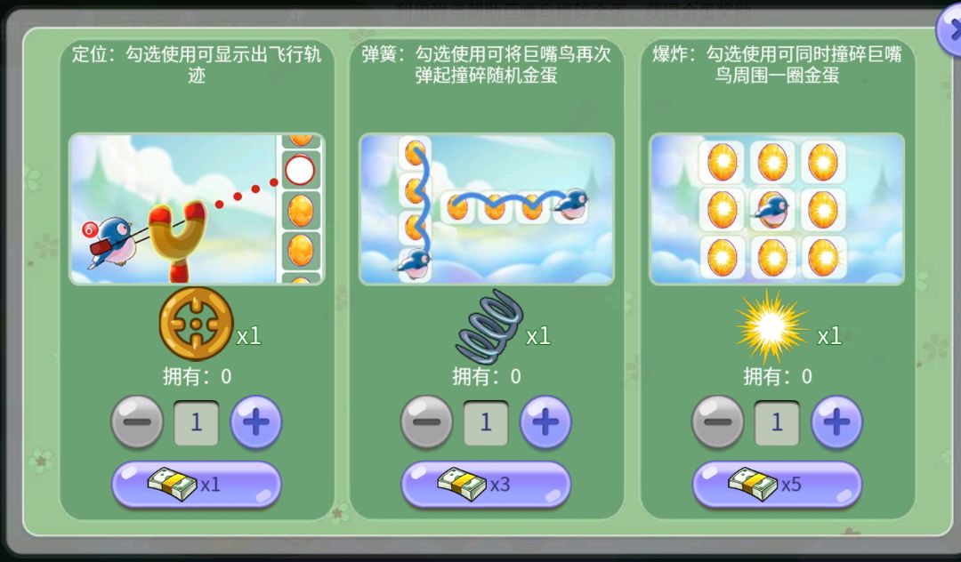 不同道具带有不同效果,可以根据金蛋数量、位置进行选择。