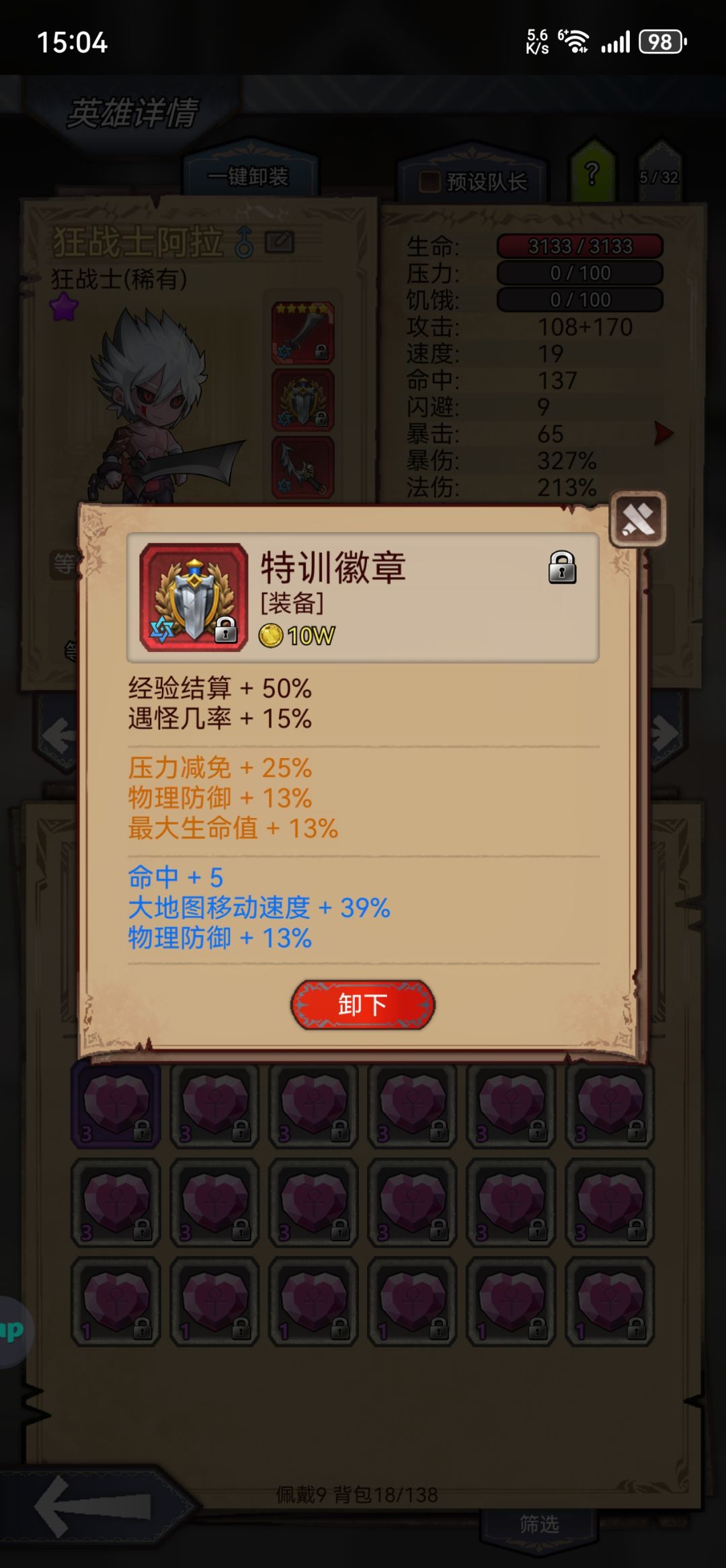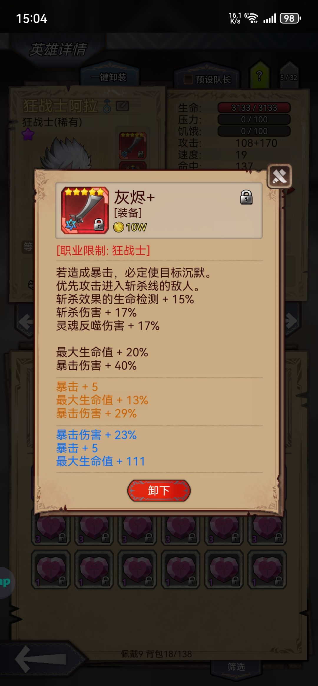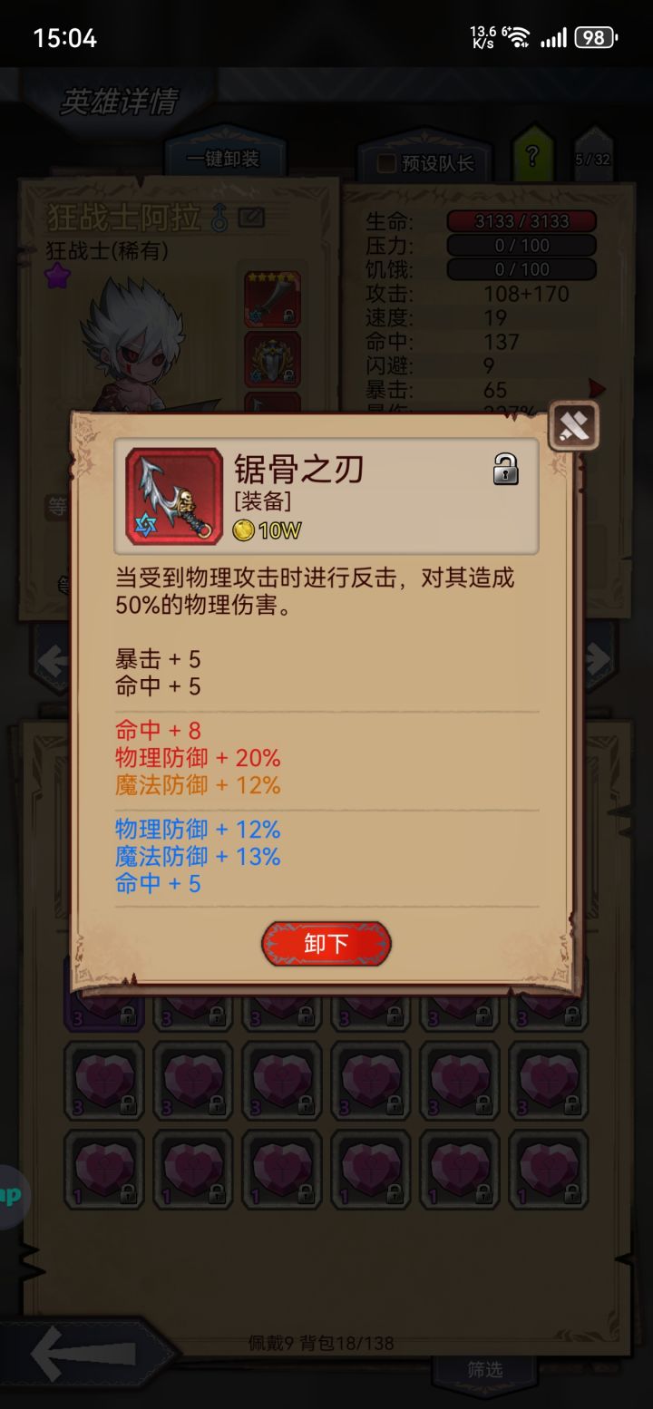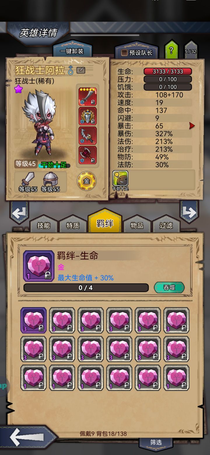 生命羁绊一紫一绿一白,(绿白羁绊就是充数的,单紫就够了)命中131就行,暴击过得去就行,挨打就有。这么少的资源做到单刷,还是有缺点的,就是碰到人形怪要吃药。不过看着经验百分比的往上蹦,一个字儿,香